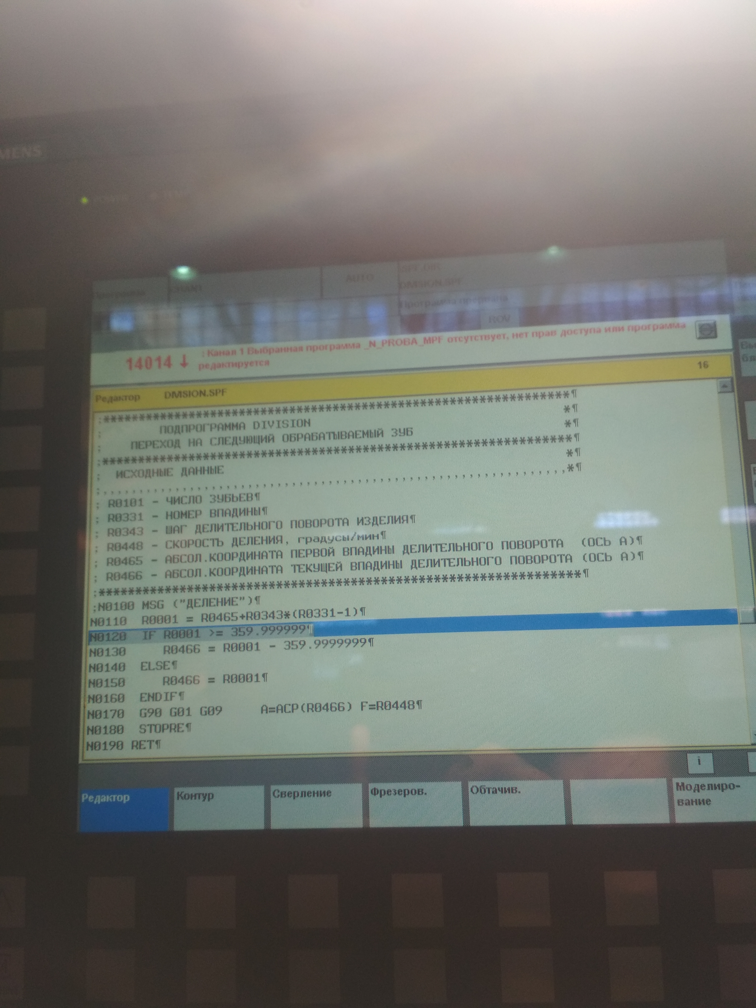 Здравствуйте! Знакомлюсь со станком зубошлифовальным SZA 868 на sinumerik 840d. Подскажите пожалуйста, куда и главное что вписать в подпрограмму, чтобы был подъем круга после прохода впадины. т.е. круг проходит по впадине - потом он должен подняться на безопасное расстояние - шпиндель поворачивает деталь на обработку следующей впадины - круг опускается и шлифует следующюю впадину и т.д. до последней впадины. После замены батарейки и сброса NC & PLC с последующей переустановкой архивов пропали почему то строки из подпрограммы, Помогите кто чем сможете или хотя бы укажите путь куда рыть и как вписать этот макрос с опущением и поднятием круга. Спасибо за внимание!