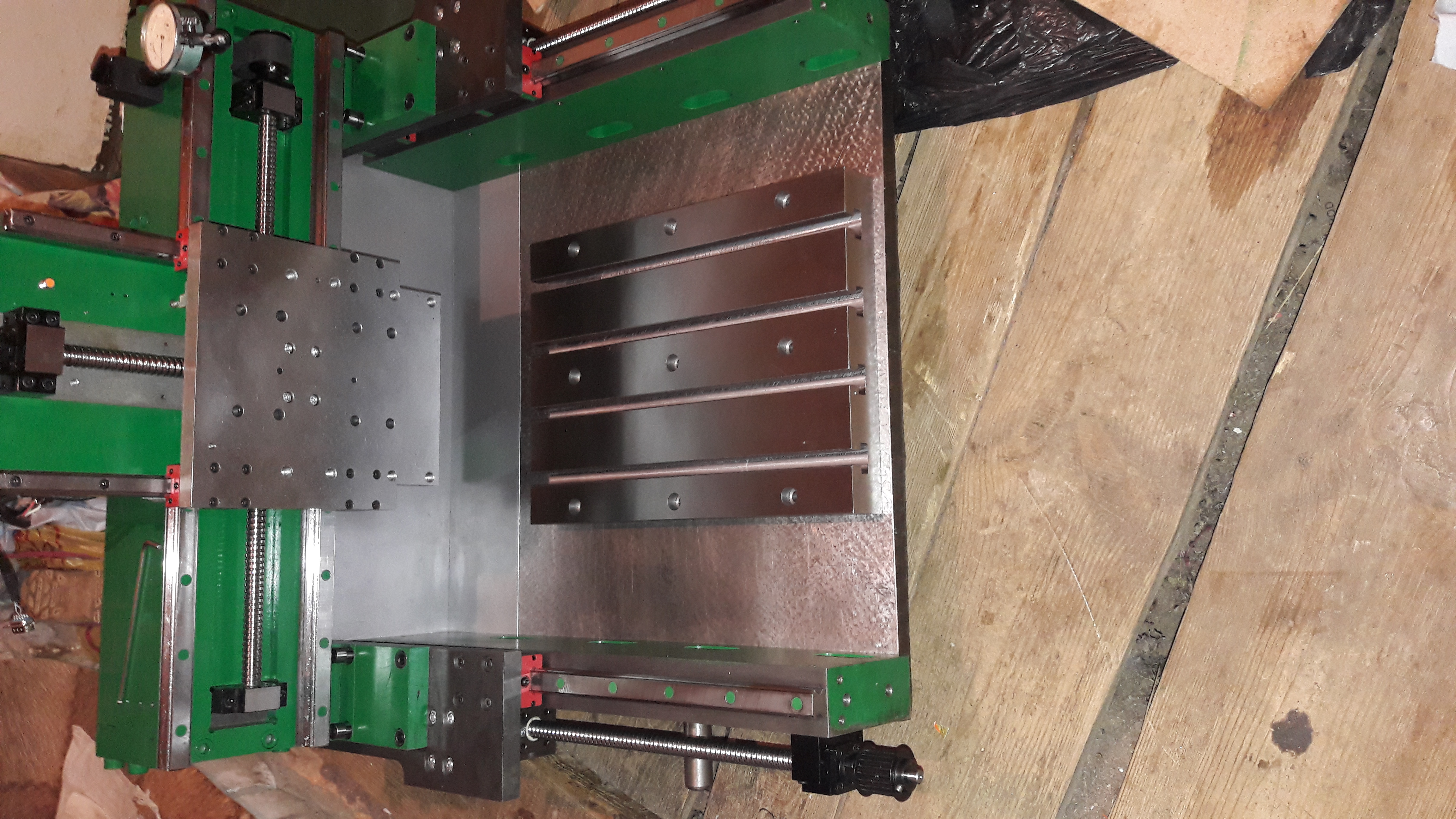 Жду прихода трех винтов фирмы TBI с двойной гайкой и обработанными по моим чертежам. И продолжу постройку дальше. Стремлюсь выйти к результатам точности геометрии станка везде в 0 мм. Общий вес на данный момент станка взвешивая каждую деталь 350 кг.