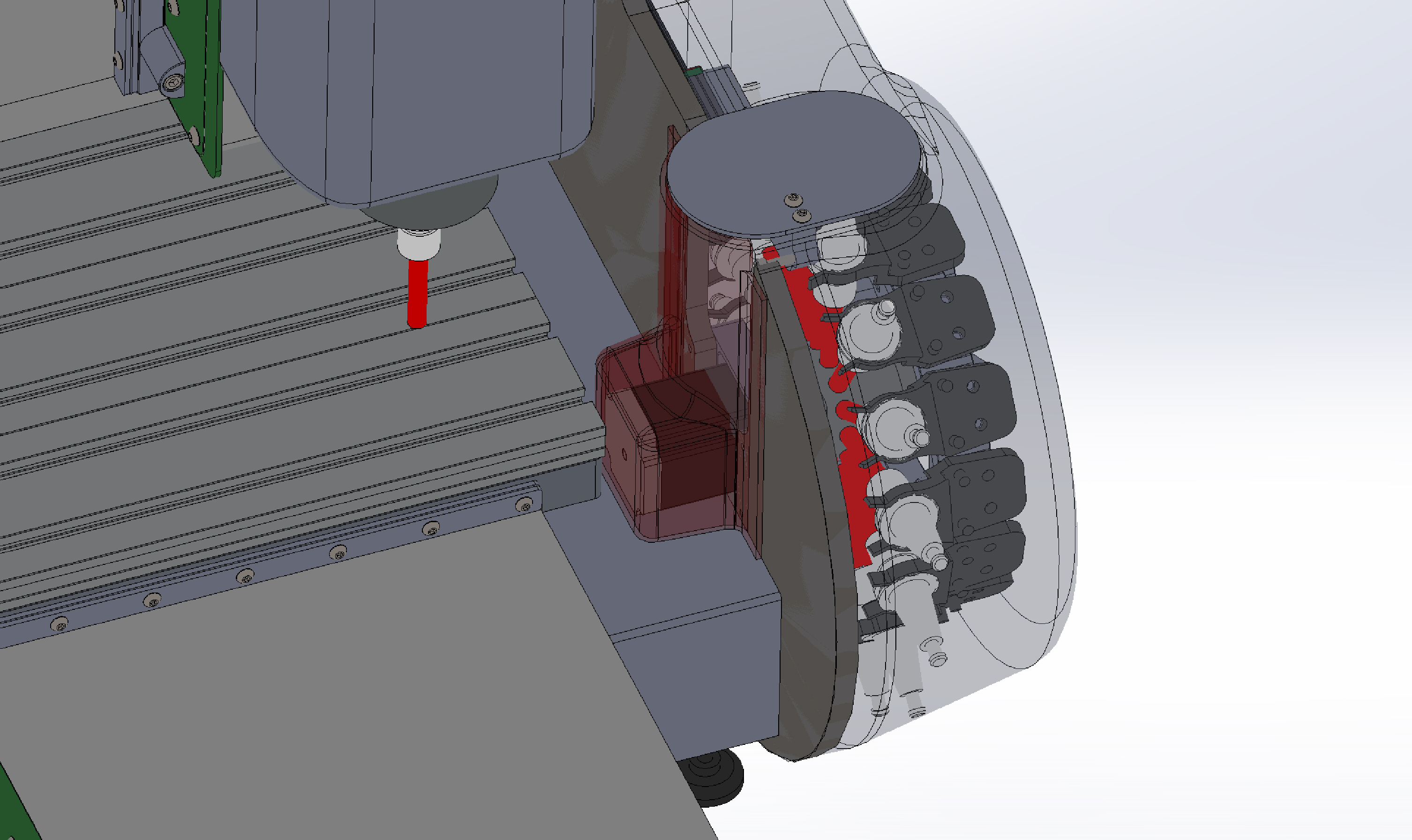 на самом деле расположение очень кртое, если его еще доработать и сделать универсальную версию под среднестатистический станок с неподвижным порталом, вынести мотор наружу, доработать пылезащиту и я бы купил к примеру и присобачил себе. китайцы вон продают автосменщики только я прикинул хрен к носу и понял что мне его никак не приделать к своему станку без глобальных переделок.