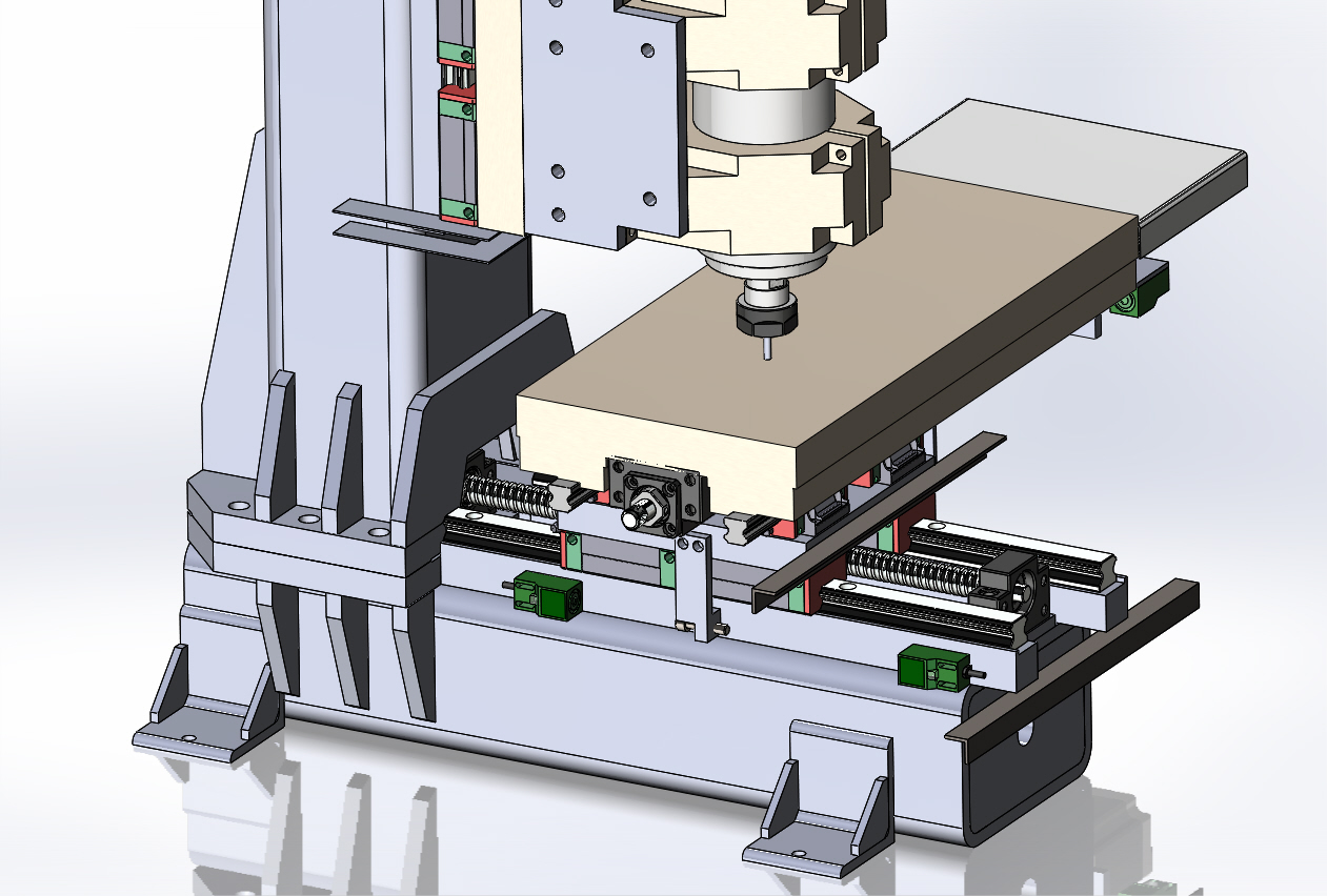 Разлёт стружки - это одно, мне с этим бороться рано. Это дело кабинета. На этапе проектирования главное предусмотреть именно защиту рельс и ШВП. Думаю, что стружка не должна залетать снизу вверх под стол. По бокам стола вниз расположил металлические листы с желобками для слива возможной СОЖ со стружкой. Из-за этого ход по Y на 20 мм пришлось уменьшить, чтобы не увеличивать габариты станка и вылет шпиндельной бабки. Пока так придумал:
