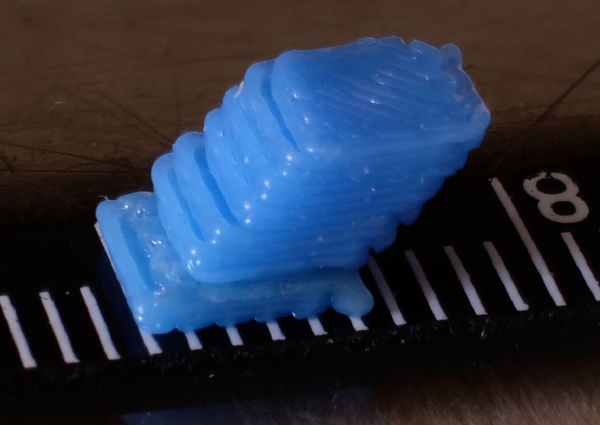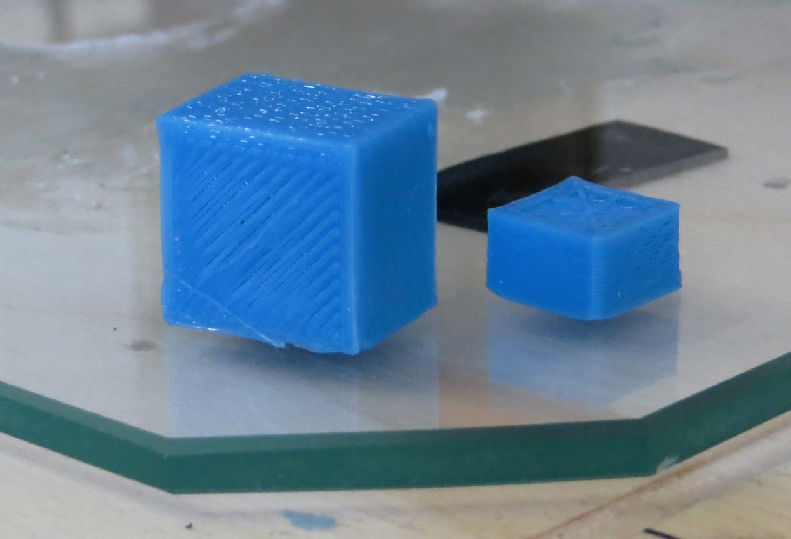 Напечатал кубик 5 мм - самый маленький из тестовых моделей - напечатал ПЛА пластиком на стекле - без подогрева и без промазывания стекла чем либо. Протер только перед использования средством для мытья окон. И все напечаталось. На фото квадратик вытянулся в прямоугольник - хотя реально квадратик в сечении.