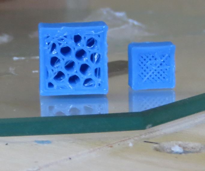 Кубик с гранью 10 мм - печатался 11 минут, а кубик с гранью 15 мм печатался уже 45 минут. я специально остановил печать и не допечатал верхние закрывающие слои, чтобы посмотреть заполнение - Сетка и Соты. Печатал без подогрева на стекле, помазанном обувным клеем. Держалось хорошо - еле отодрал. На 15 мм кубике - по углам 15 мм точно , а по центру граней 14,5 мм -а говорят, что у PLA пластика усадки нет.