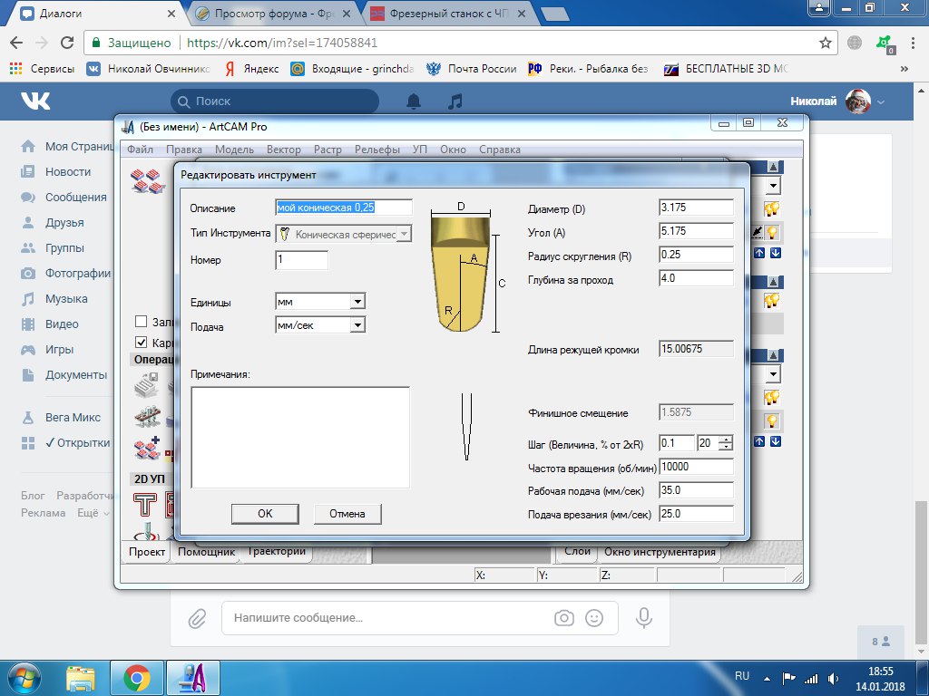 добрый день хотел спросить на счет арткама и фрез. купил фрезы . размер R0.25x3.175x15x38L и R0.5x3.175x15x38L. как их и куда добавить в арткаме и чего писать? как понятно - любую фрезу выбрать и редактировать. а вот чего на такие фрезы писать нужно не знаю. работать по дереву. я просто только учусь, по этому еще очень мало знаю. по умолчанию в арткаме таких нету(