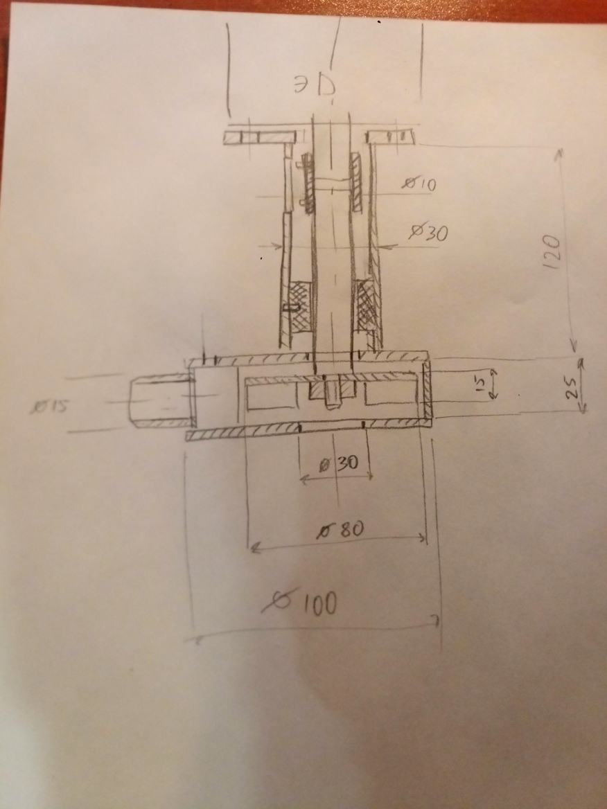 Корпус насоса - две пластины 1,5-2мм не обязательно круглой формы в одном из которых сделано отверстие равное диаметру вала+4мм, с другой отверстие 20-30мм для входа жидкости. Между пластинами находится кусок трубы диаметром 100мм, относительно оси отверстий пластин со смещением на 20мм.