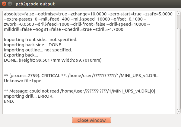 я работаю в альтиум последней версии.вот сделал плату - вывел гербер нижнего слоя - естественно отзеркаленный.а также вывел дырки через нц дрилс.дырки вышли как в тхт формате так и в стандартном дрл.теперь задача сделать гкод - у меня есть две проги - флаткам (ужасно сложная для меня),и псб2гкоде - простая но че то моросит она,нижний слой меди герберовский нормально читает и конвертит,но дырки не конвертит,вон что пишет