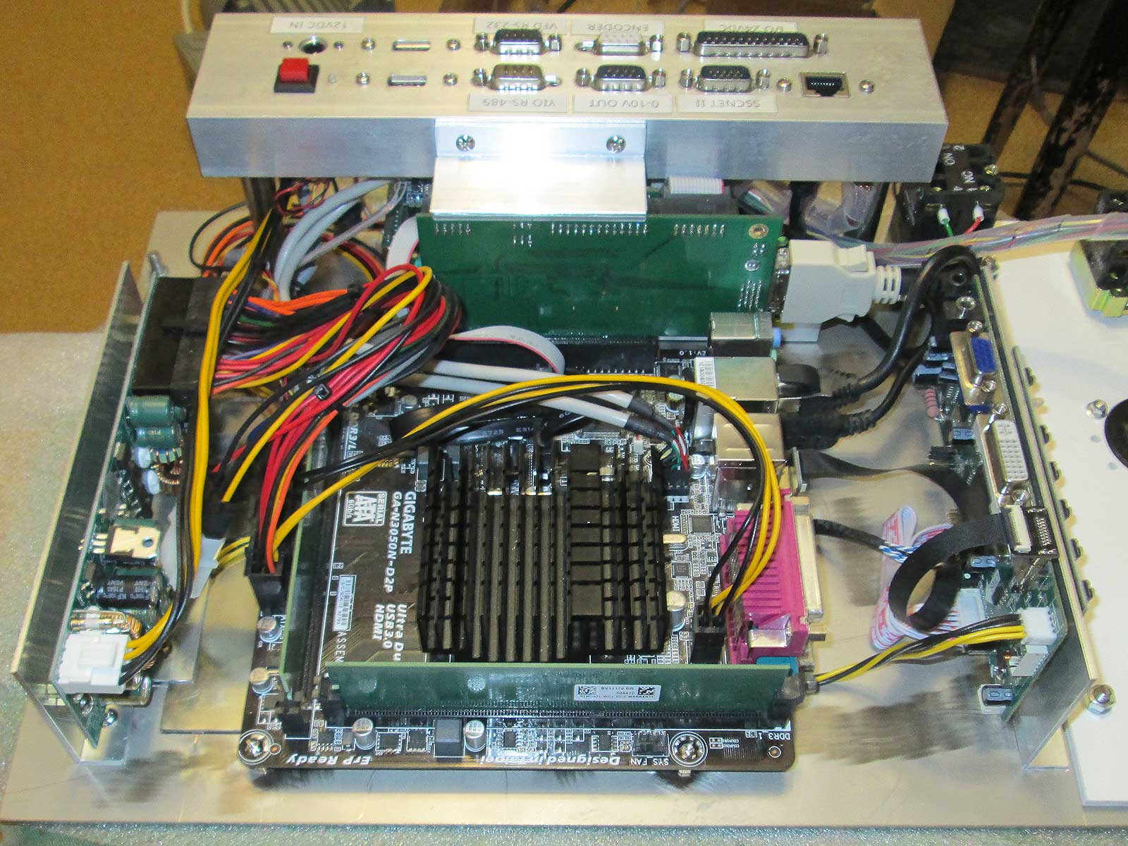 Справа - обычный "одноплатник" - компьютер, разъёмы все стандартизированны(перепутать сложно)! зелёная платка над компом - либо палата "клавиатуры", либо "сенсора"(смотря что на морде приделано).