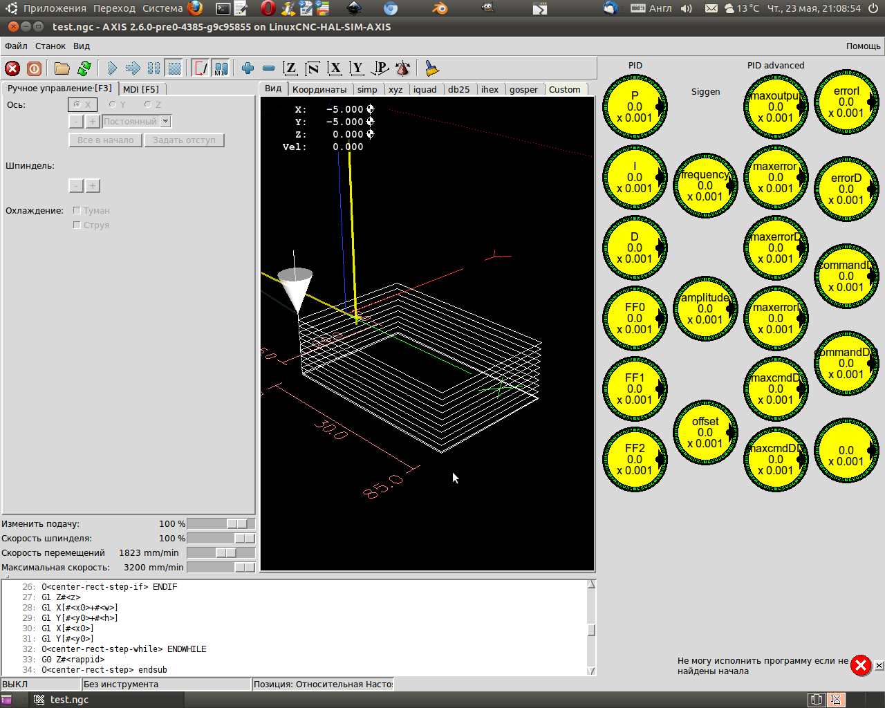Nick писал(а):хмммм какие-то странности с Окодами... Может это конечно из-за того, что у меня версия LinuxCNC кривая и стоит на 12.10... В общем ловлю странное поведение при разных о кодах.