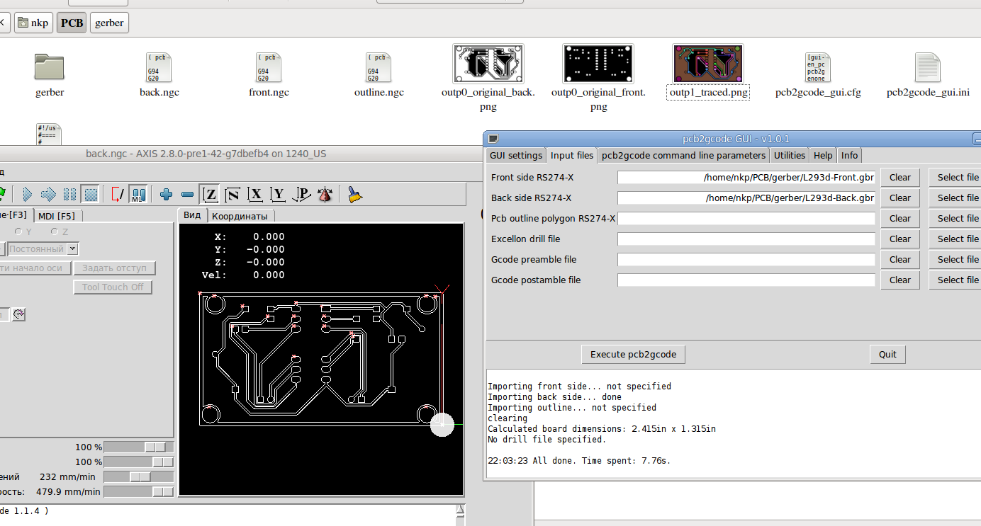 pcb2gcode --metric --zsafe 2 --zwork -0.06 --offset 0.2 --zchange 25 --mill-feed 100 --mill-speed 5000 --front $frontИмеется возможность создания управляющегго файла, в котором записаны часто используемые параметрыи, что позваляет сделать сразу 3 фала для верхней и нижней стороны платы и сверловку. Но у меня не получилось его запустить.
