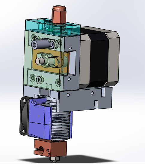 Блок экструдера частично моей разработки и изготовления. Готовые брал: радиатор нитки, вентилятор радиатора, вентилятор обдува модели, фитинг верхний под 4мм трубку, сопло, блок нагревателя, нагревательный элемент, термодатчик, мотор, шкив проталкивания нитки, подшипник, пружинка и винтики, т.е. те вещи которые продаются практически на каждом углу или на ali, и стоят сильно недорого.