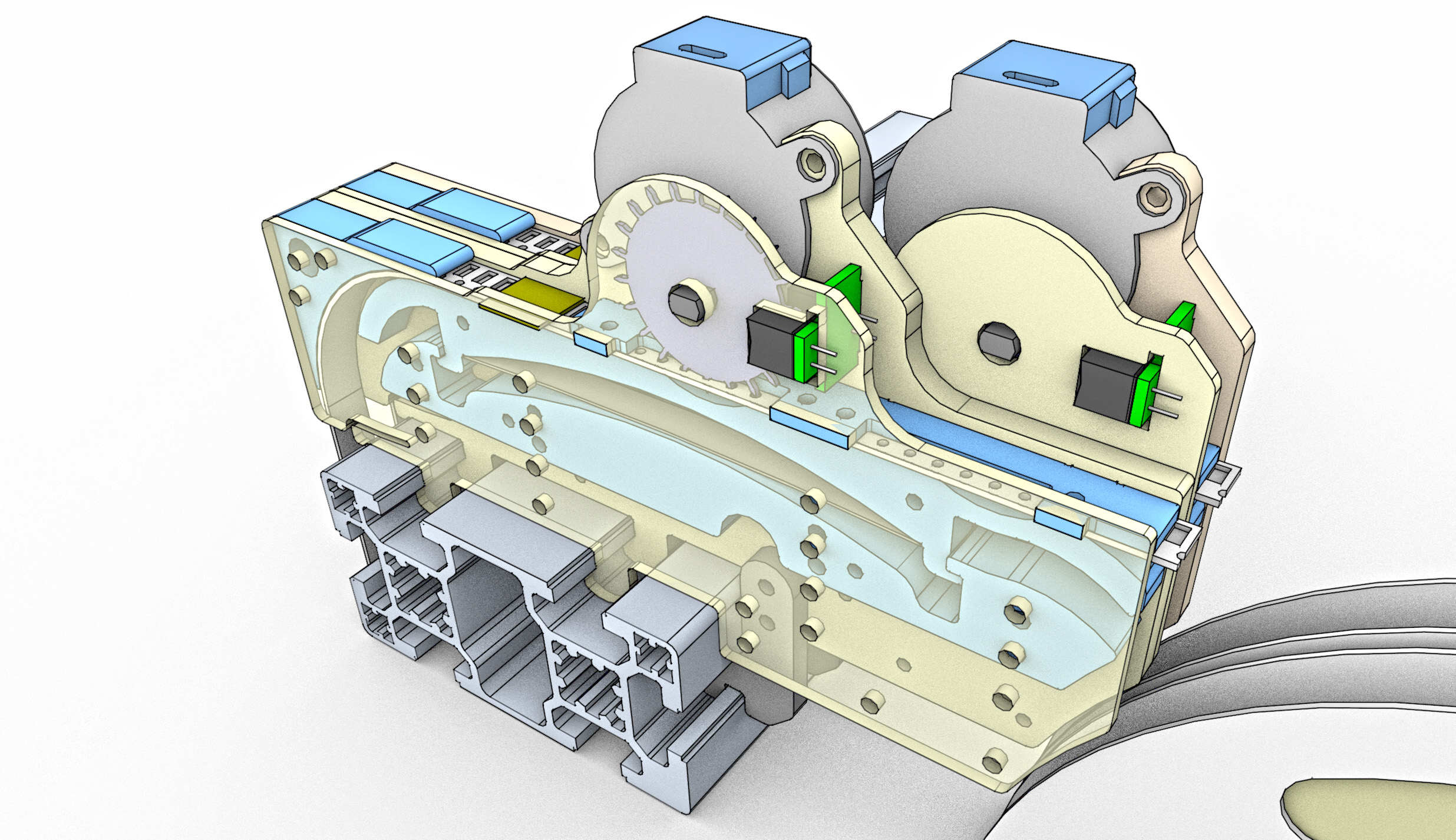 Прижим ленты получился довольно сложным, потому пришлось перенести моторы и датчики на верхнюю сторону.