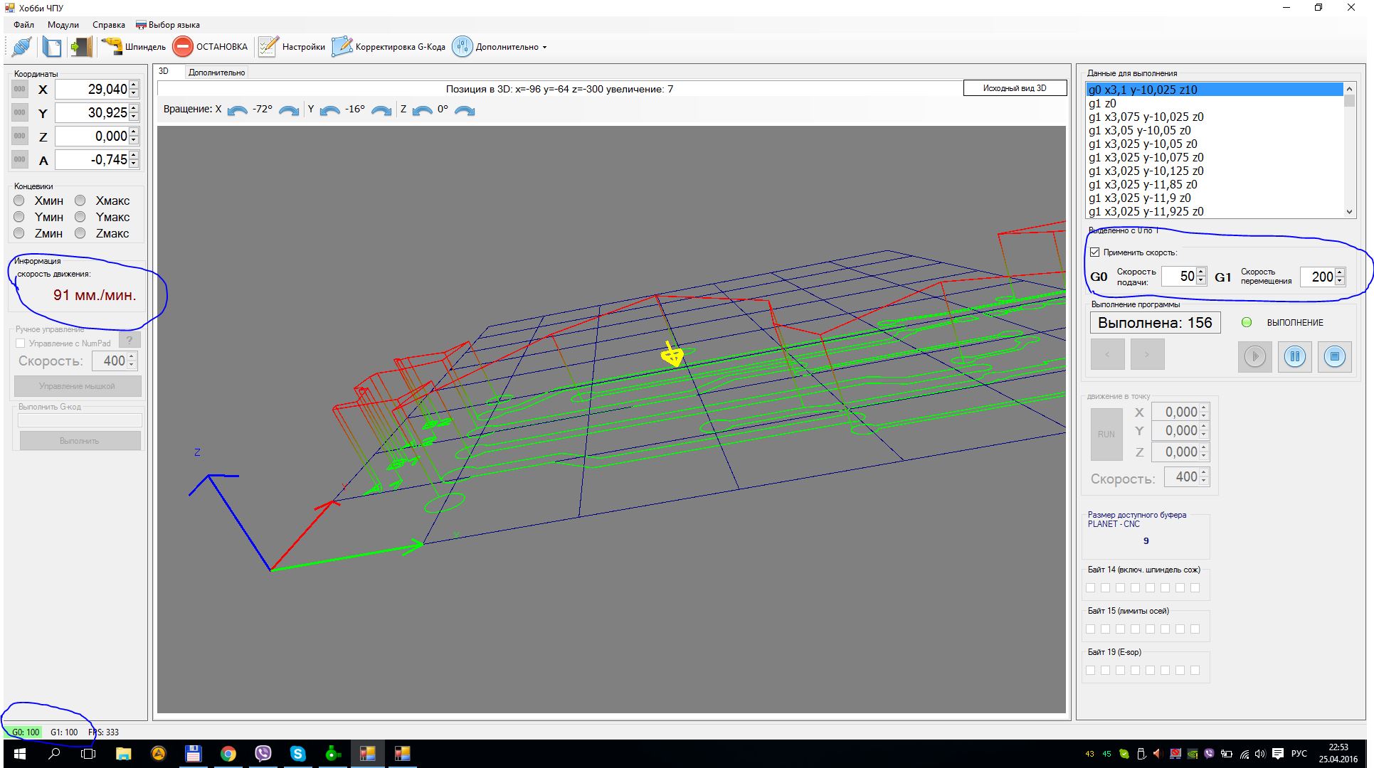 Установка скорости в модуле посылки g-кода, скоро заработает, из-за глобальной переписки программы, я еще пока не вернул этот функционал.
