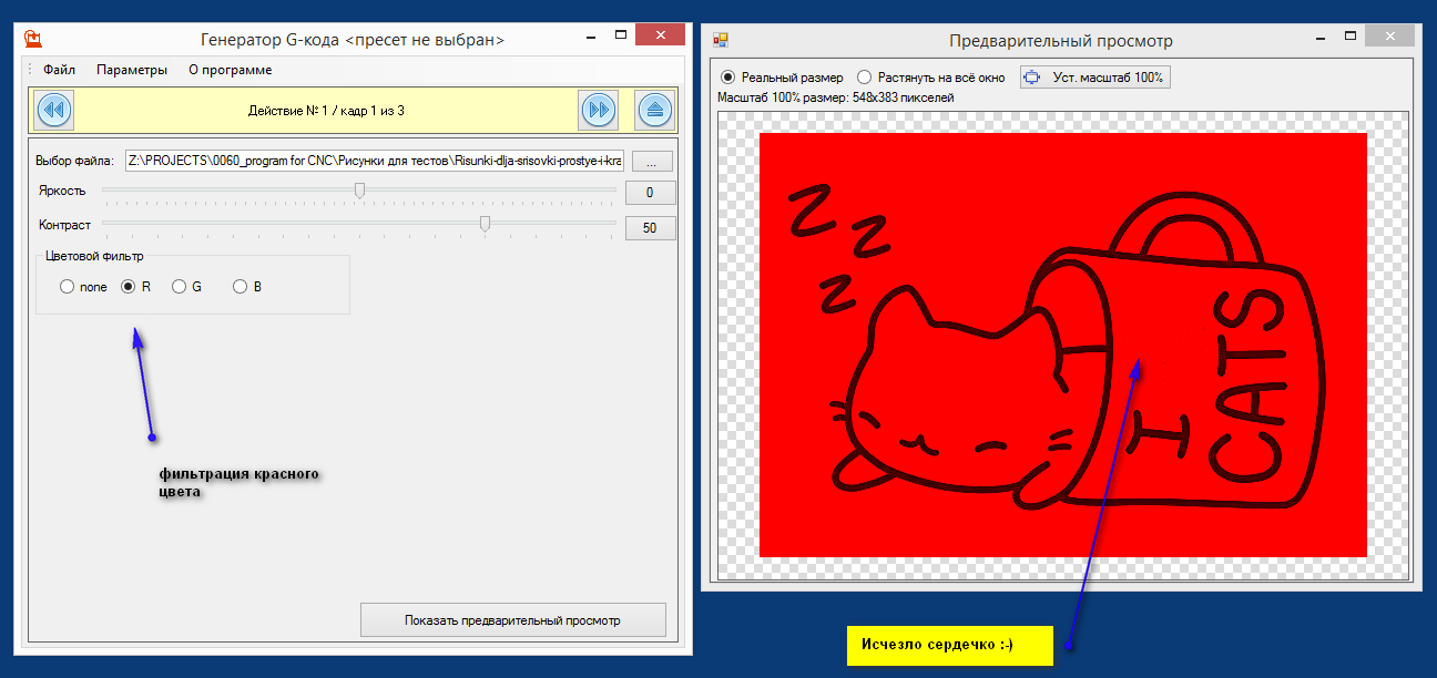 В ходе тестов 3-й версии, кроме яркости и контрастности, добавил фильтр RBG, и случайно заметил что получается ещё интересная штука.Rom327 писал(а): И еще просьба, если получится: неплохо бы прямо в программе иметь возможность менять яркость/контрастность картинки для работы с точками. Это для того, чтобы избавиться от пережога, когда точка новая жжется на черном ореоле предыдущей. То есть сгенерил картинку, посмотрел в увеличенном виде и понимаешь, что на черном очень много точек либо часто расположены и будет пережог. Вернулся, чуть осветлил картинку и снова сгенерил и сразу посмотрел...