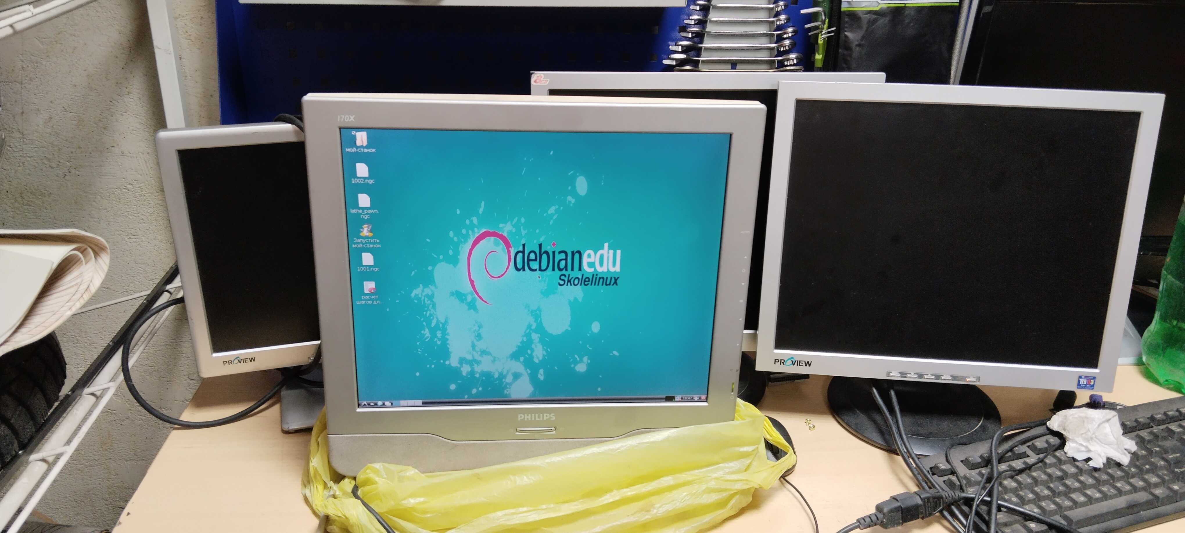 Мониторы ProView также прошли восстановление: были заменены конденсаторы в блоках питания и лампы подсветки на светодиоды. В матрицах имеются дефекты: следы от воды (темные пятна) и вертикальная полоса. Для трех мониторов предусмотрены только два кабеля питания, аналогичные тем, что используются в ноутбучных блоках. По поводу модели Филипс не могу сказать точно, так как не помню.