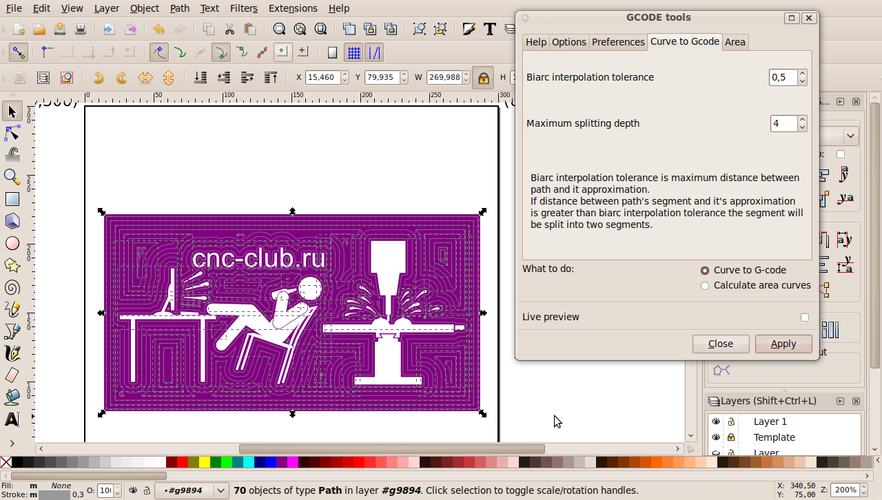 What you'll get: a group will be added to the drawing which shows cutter's working trajectory, and of cause a file in specified directory which will contain Gcode.