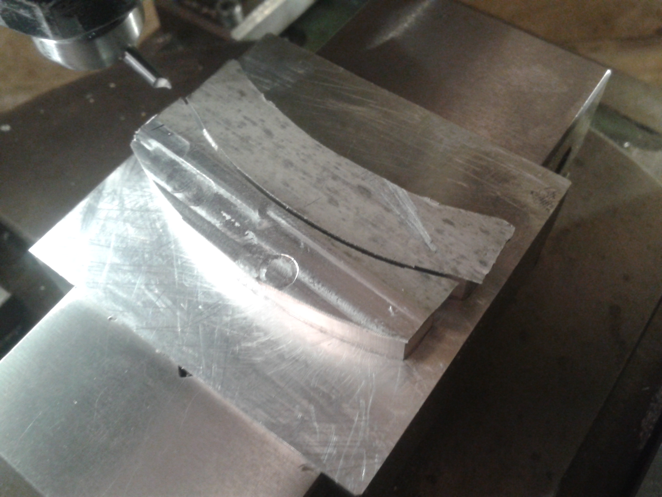 Фрезернул другу моделисту карман в модели(гоночная модель). Ай прямо без чистовой....фрезу двухзубую восьмерку дал он ,быстрорез под сферу заправленный в ручную.В общем от своего учебного пособия не жду чистоты при большом съеме. подача 120 оборот 4-4.5 тысяч. Прогу писал вручную,один кадр и размножил :hehehe: с шагом по 0.5мм.