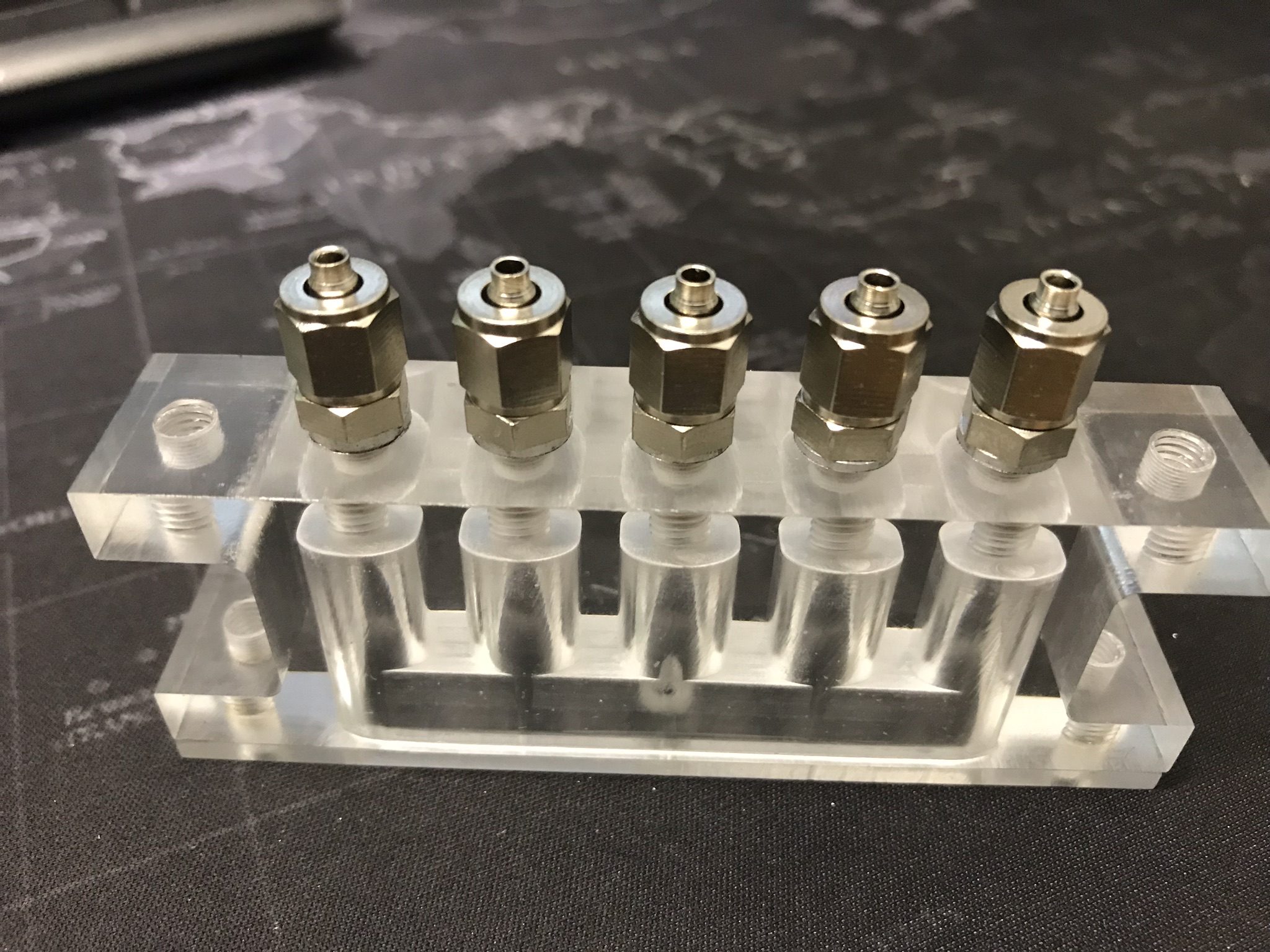 Самотек захотелось попробовать ввиду его простоты изготовления и эксплуатации. Предварительно было опробовано на отдельно лежащей каретке путем налива через шприц. Основное опасение было связано с возможной проблемой завоздушивания тонкой трубки с внутренним ф2мм. Это случалось у людей на токарных и лечилось срезом под углом трубок перелива. К счастью в процессе тестов этого не наблюдалось и приступил к реализации. Распределитель сделан прозрачным для визуального контроля и разделен на секции объемом 2мл. Резделение на секции обеспечивает равное поступления масла ко всем точкам смазки независимо от длины магистрали, время немного будет отличаться, но порцию смазки все получат одинаковую. Это и есть основная идея, а это реализация: