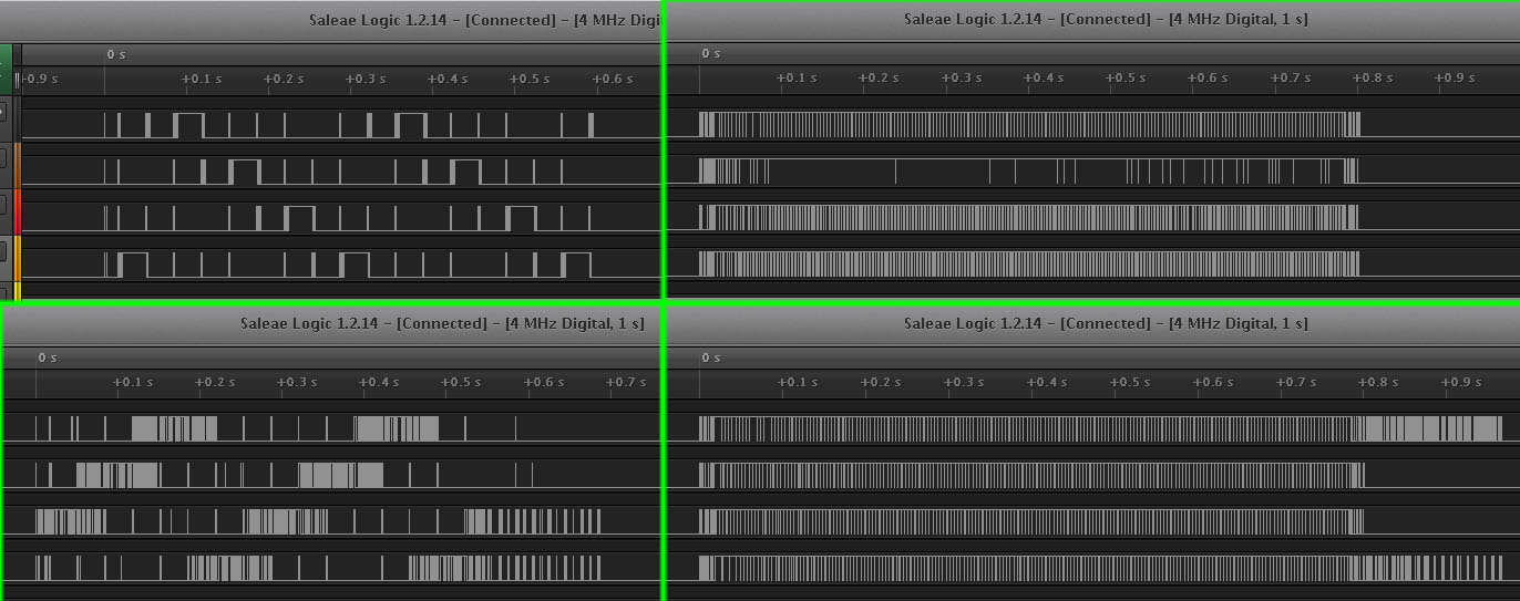 Спасибо, проверю это предположение. Однако более вероятны проблемы в драйвере. Вот пытался снять диаграмму с обмоток (не совсем верно снимал, но в принципе зависимость видна): Сверху нормальный драйвер, снизу с пропусками. Слева пошаговый режим (точная настройка позиции), справа рабочий.lkbyysq писал(а):Подшипники закоксовались