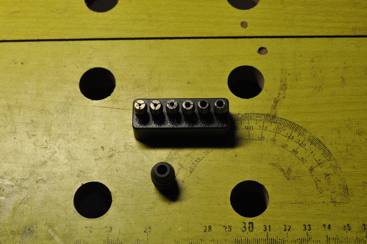 Набор цанговых зажимов. В комплект не входит, но может понадобится, если вы собираетесь что-либо фрезеровать. Из зажимного патрона фрезу 3.2 мм у меня вытаскивало очень быстро, как бы сильно я ее не зажимал.