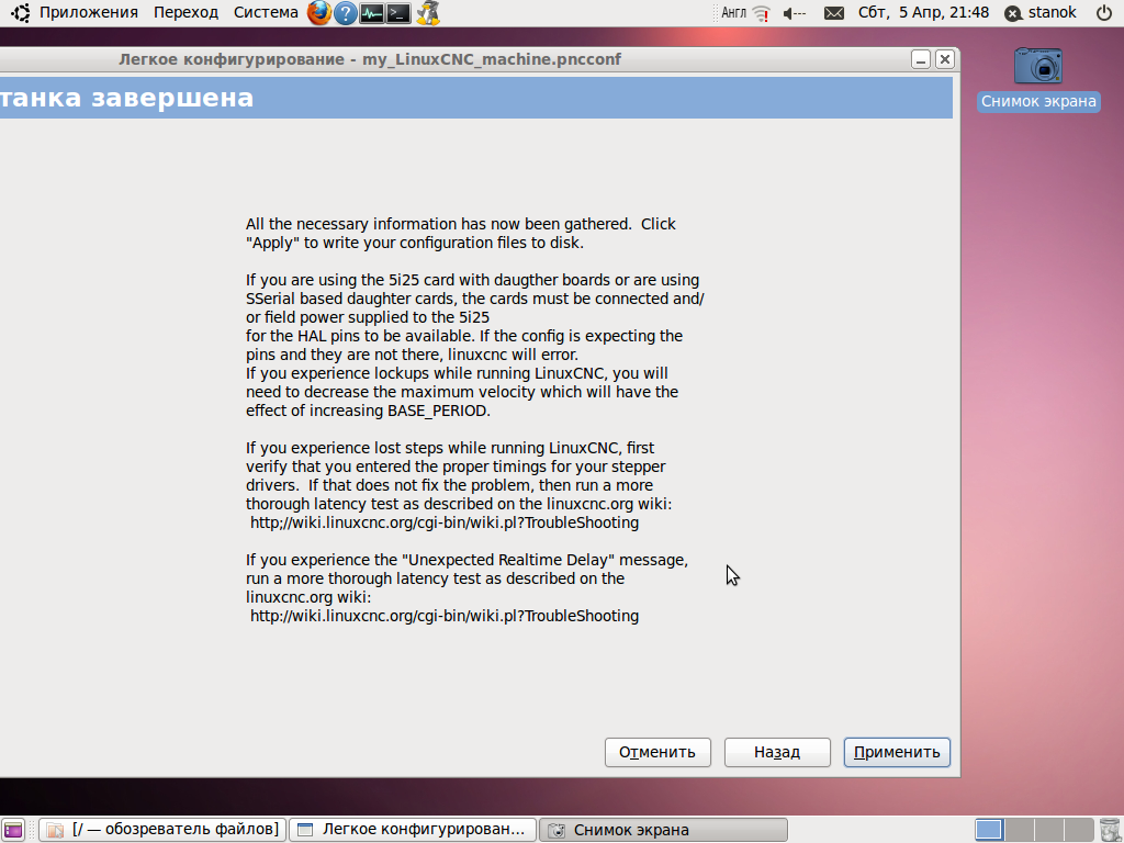 если выход на шпиндель убрать то конфигуратор нормально заканчивает работу, и даже LCNCпотом запускается