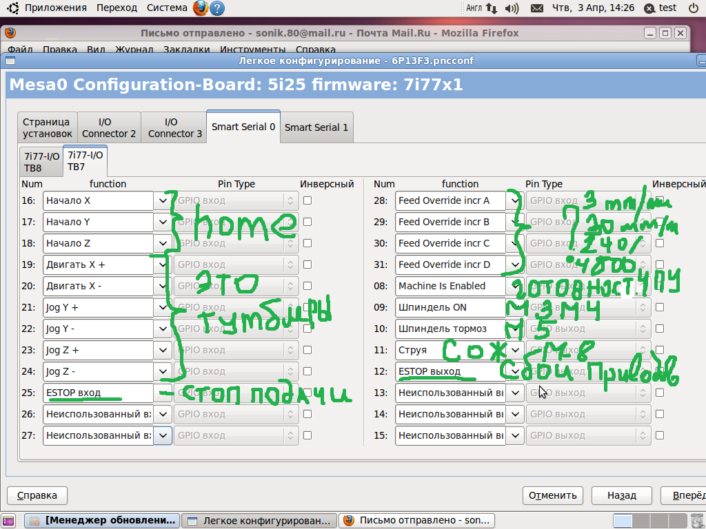 Всем Здравствуйте ! Я новичок в теме LinuxCNC- вот месяц как получил связку Mesa 5i25+7i77. А благодаря этому форуму узнал очень много нового и интересного.