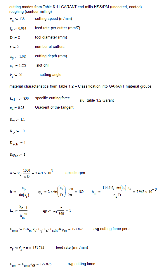 Прошу посмотреть опытным взглядом, нет ли где ошибки. Считал по Garant Machining Handbook, для ихних фрез (GARANT end mills HSS/PM) и черновой обработки. Чуть меньше двадцати килограмм получилось.
