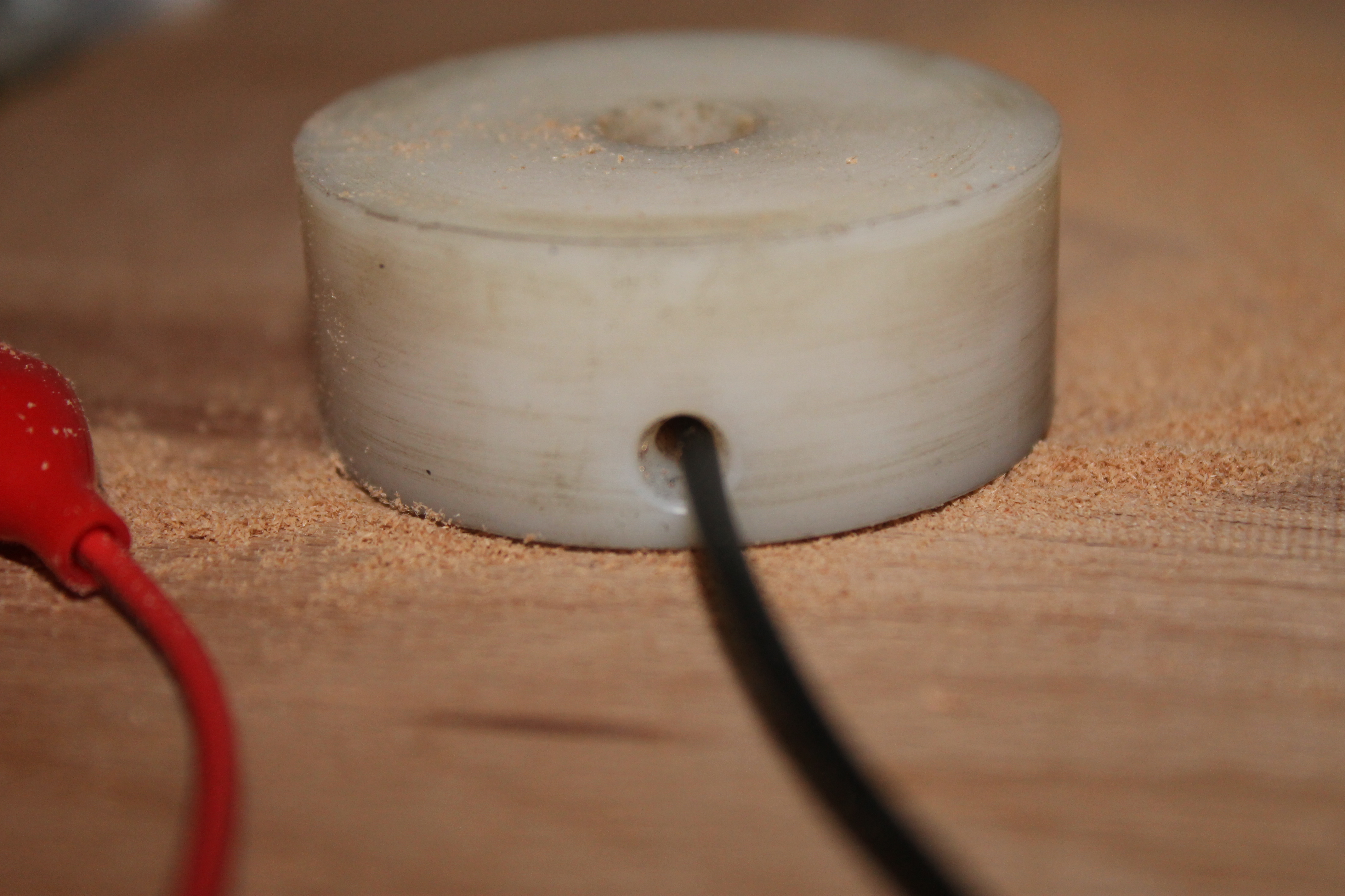 Сделал датчик компенсации длины инструмента. В общем это просто таблетка из бронзы запрессованная в корпус и капралона.