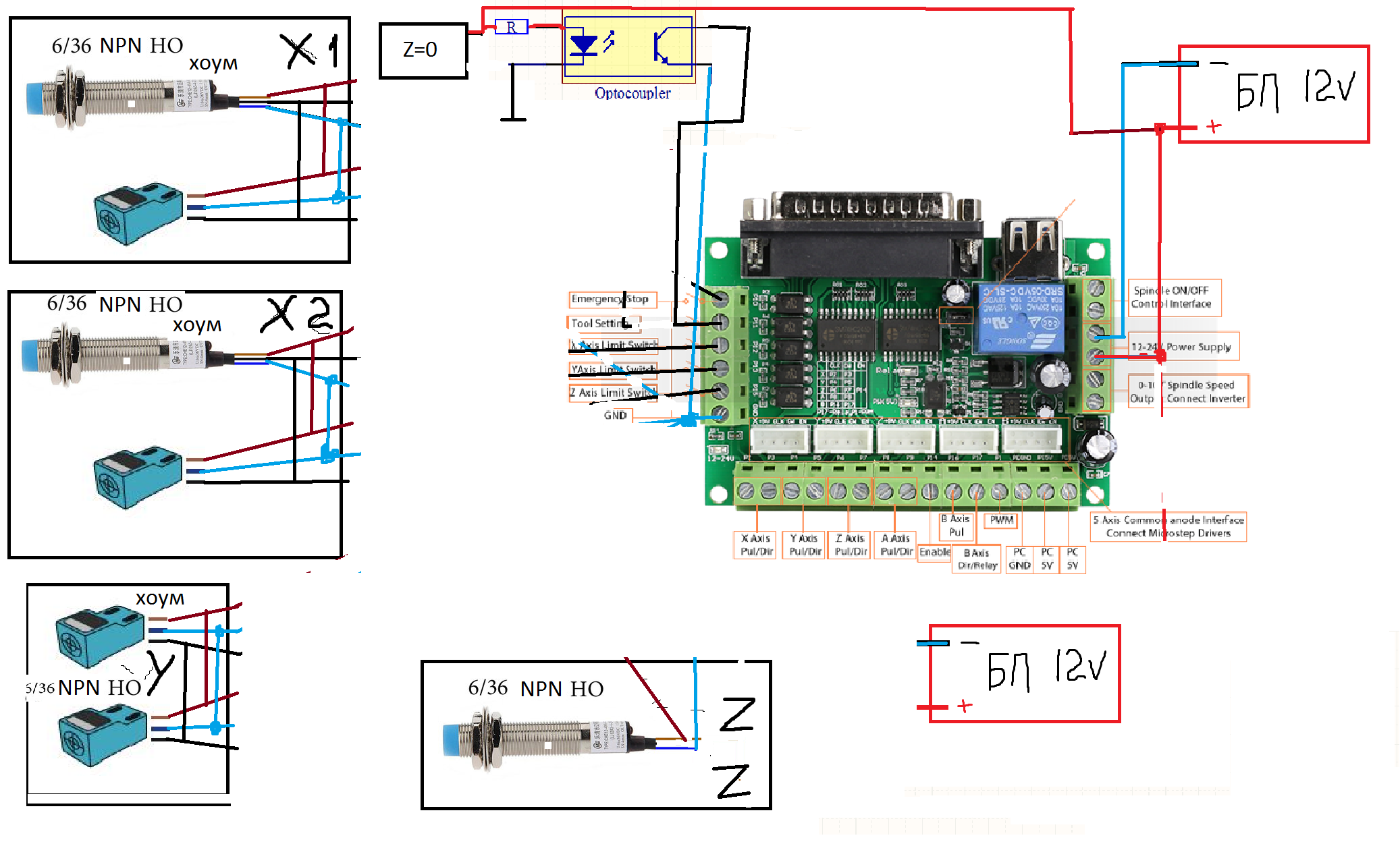 помогите развести контакты датчиков