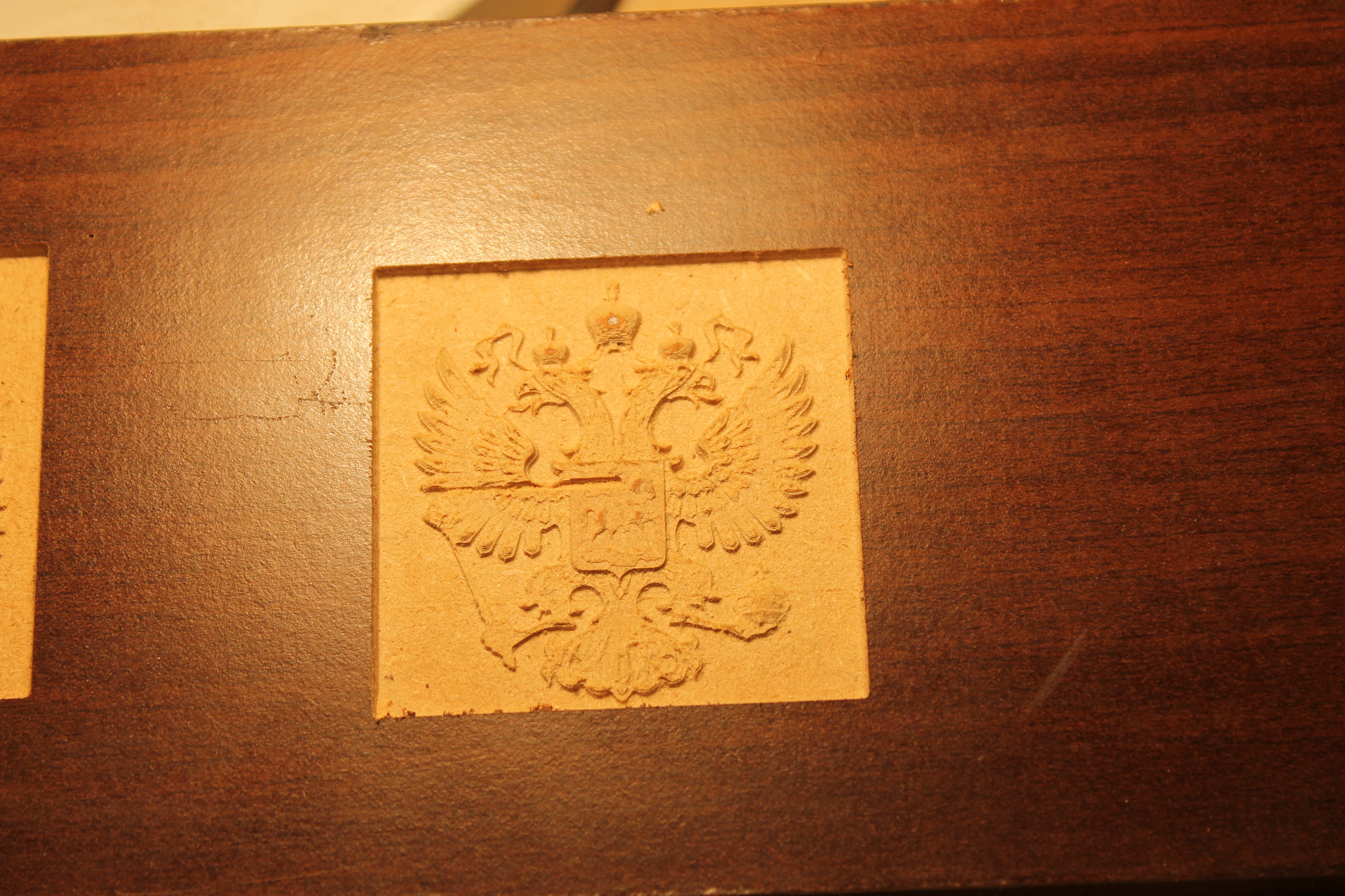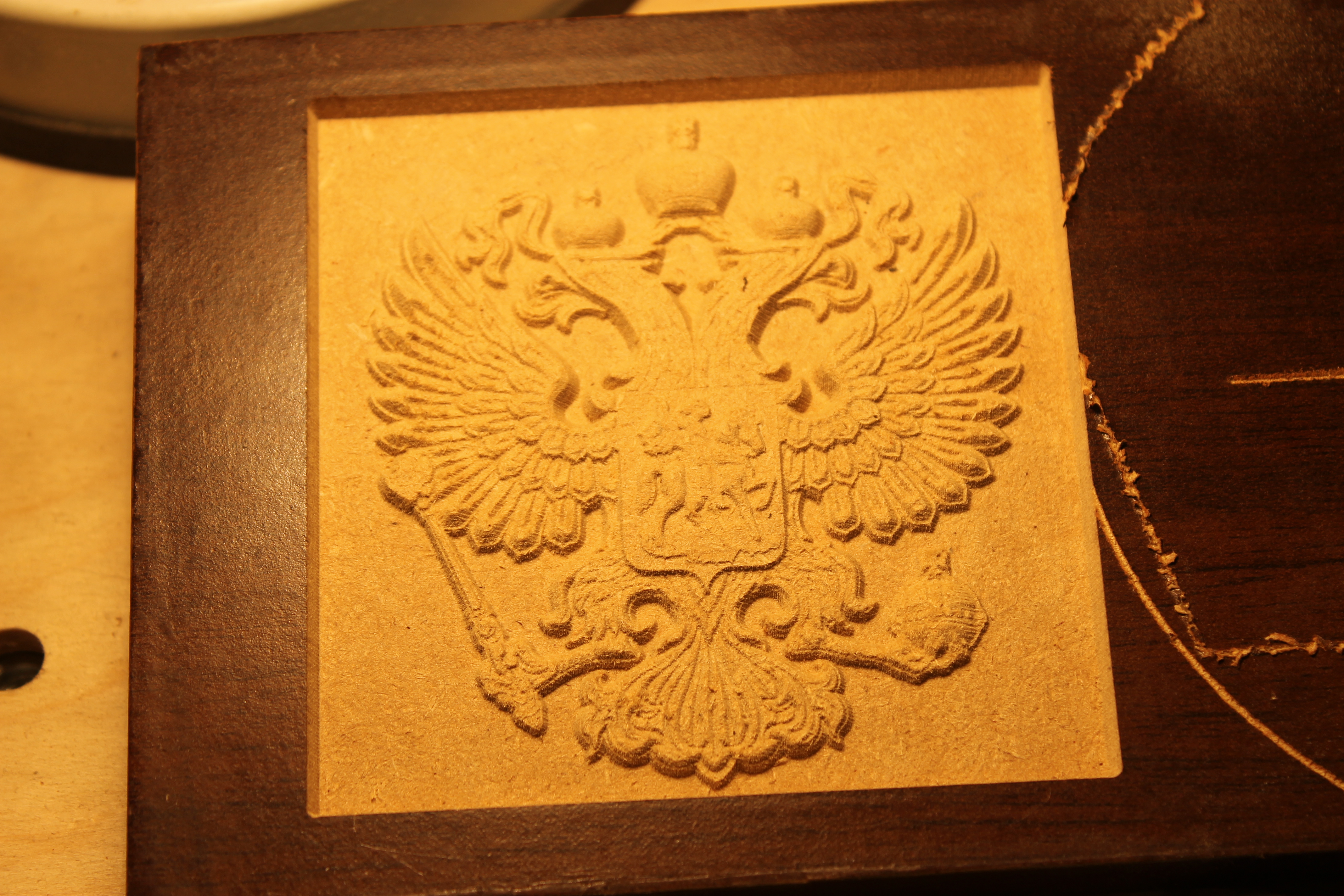 И первым делом решил попробовать его на гербе РФ, но как оказалось я недоглядел и пустил рез по тому месту, где делал настроечный рез. И как оказалось я делал этот рез поломанной фрезой.