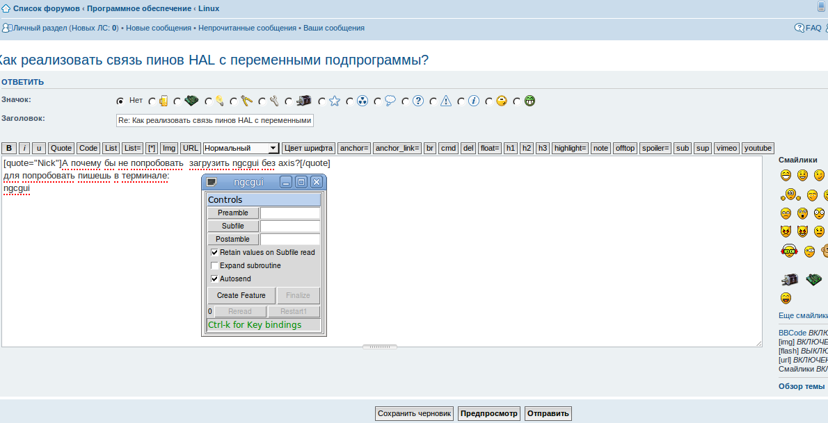 А почему бы не попробовать загрузить ngcgui без axis?Ворон226 писал(а):А вот этого я не умею. Ведь создание программы через ngcgui устраивает, но не для автомата (ну не нужен в автомате навороченный интерфейс). А хорошо было бы сделать шаблон в G-кодах с автозагрузкой и опросом значений в визуальной панели и передачей этих значений переменным в G-коды. Можно простой пример автозагрузки программы в G-кодах при запуске AXIS?