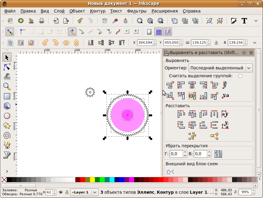 Затем центруем нашу окружность относительно шестеренок. Для этого Ctrl+Shift+A выбираем шестеренку и окружность и выравниваем их по центру по вертикали и горизонтали. (В качестве "Ориентира" лучше выбрать "Первый объект" или "Последний объект".) Создаем копию окружности (Сtrl+D или вовремя перетаскивания нажимаем пробел) и центруем ее относительно другой шестеренки. 3. Вырезаем дырки.