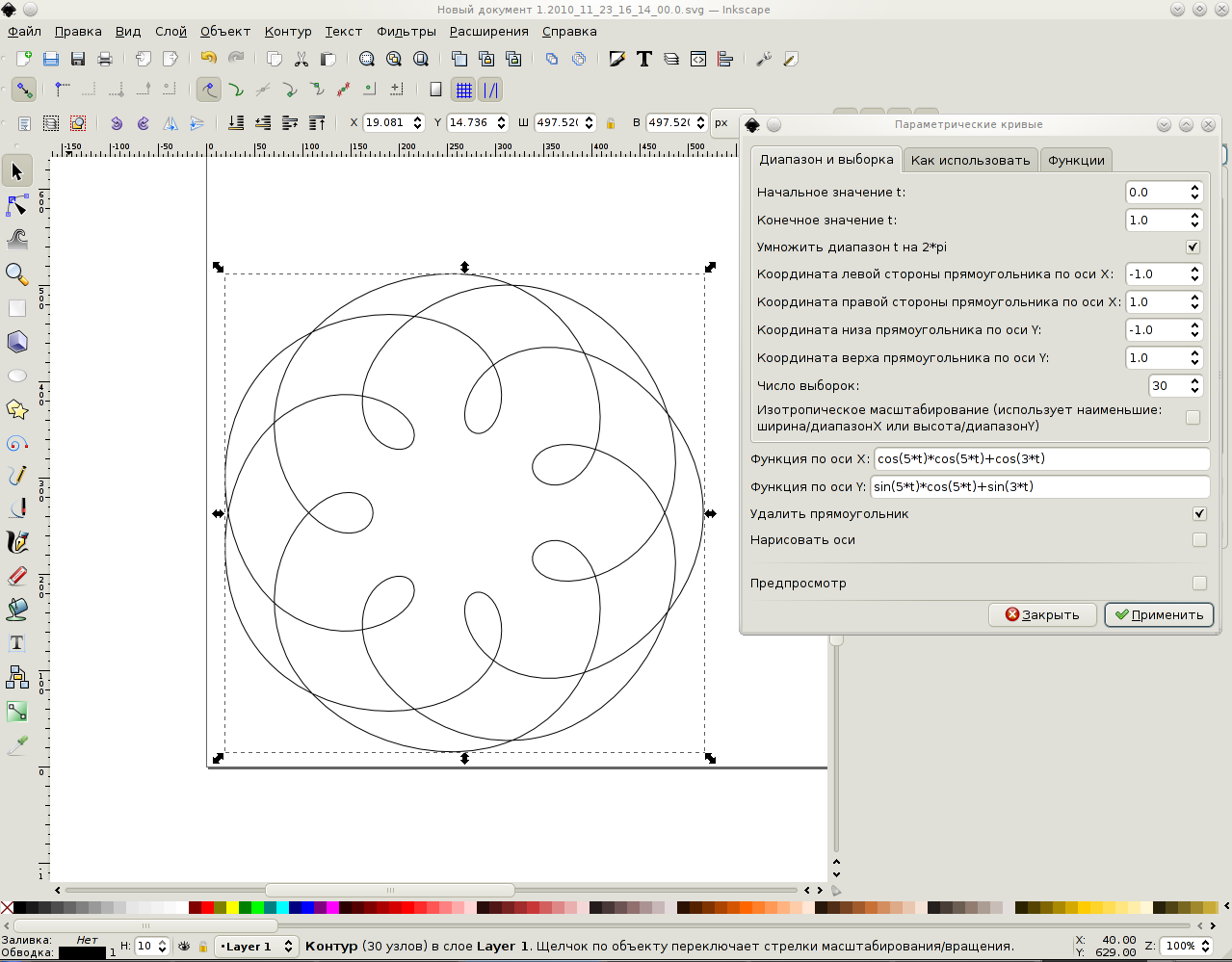 Отрываем Расширения -> Gcode tools... Выбираем Path to Gcode, выбираем имя файла и директорию и нажимаем Применить. Что мы получили: