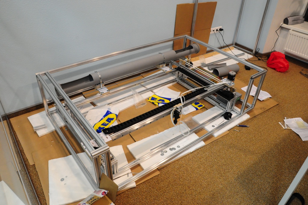 Вот немного новых фоток, уже поставил ремни и двигатели, сейчас кладу кабельканалы и планирую завтра/послезавтра поставить внутрь комп, настроить emc2 и погонять оси.