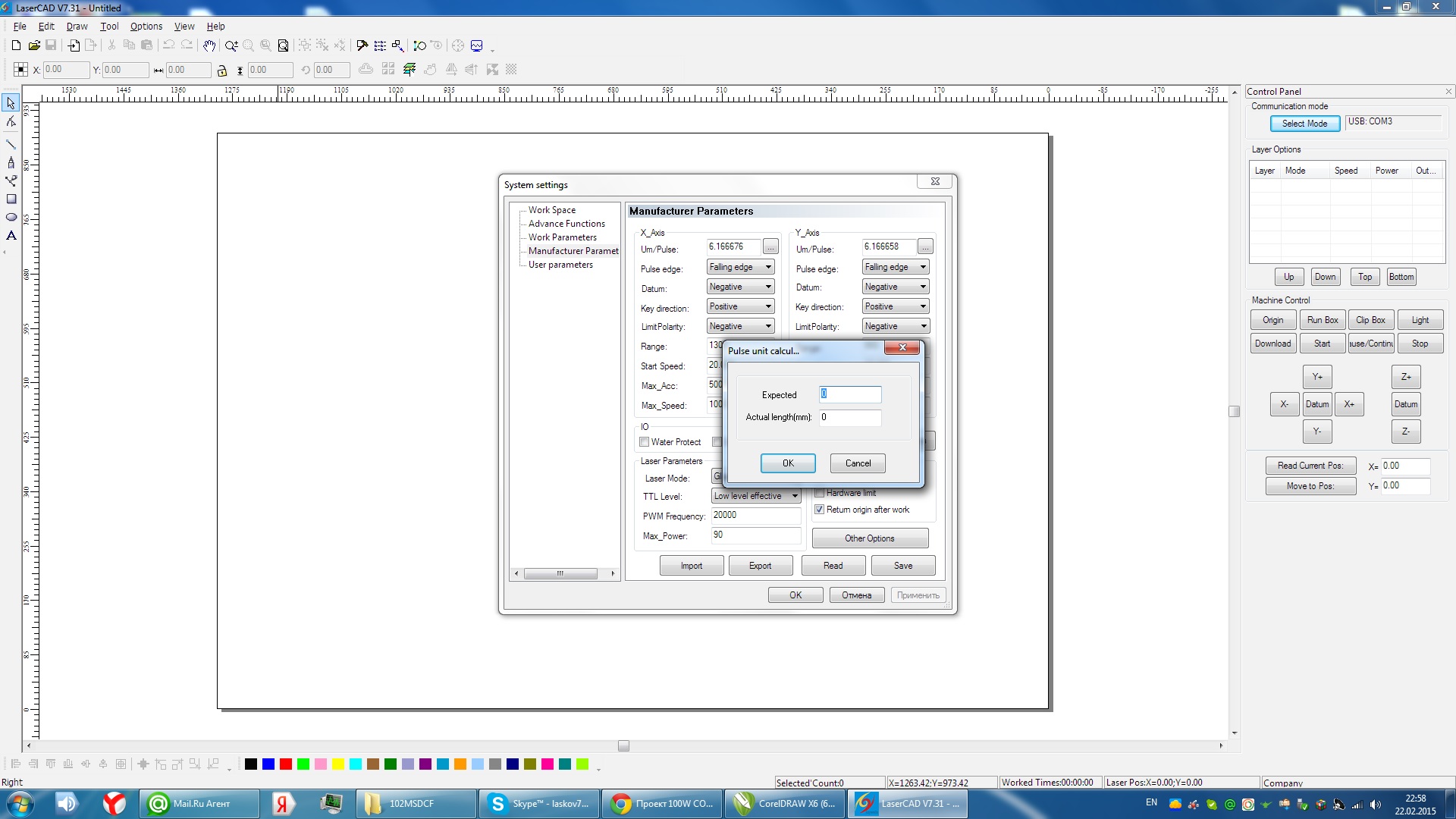 в китайских лазерных контроллерах настройка перемещения задается в количестве тысячных (микрон)долей миллиметра/импульс........т е на сколько микрон перемещается ось за один импульс контроллера...... В МАЧе наоборот- количество импульсов на один мм перемещения.......