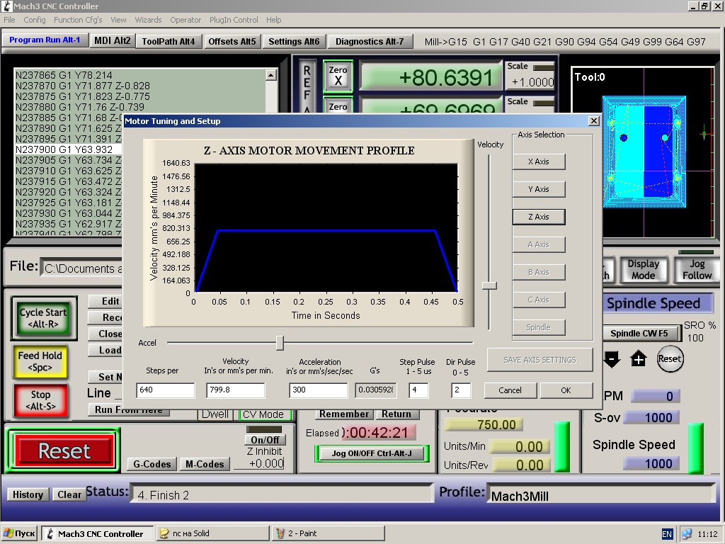 А это смотря кто к какому результату стремиться. До недавнего времени я производил обработку с максимально возможными скоростями и ускорениями. Т. е. в Mach3 мой настольный позволяет передвигать оси со скоростями 8000 мм/мин. при ускорении от ноля до полутора тысяч (выставлял на все оси 800 и по Z ускорение 1500 и скорость 5000 мм/мин). И это меня устраивало. Да и многих наверное тоже устроило бы. Реальная скорость при сложном рельефе подходила к 3-4 м/мин. Те тесты, что я делал - это просто наглядно посмотреть как влияет ускорение на траекторию (возможно скорее всего на отрисовку). В этой теме с 435 постаhttp://www.cnc-club.ru/forum/viewtopic. ... &start=420сейчас идет бурное обсуждение по этому поводу. Если выставить слишком малые ускорения, то увеличится время обработки. Нужно искать компромисс и пробовать другие системы