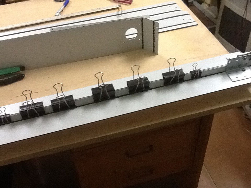 Учитывая то, что резался на большом столе, глубина прореза для гибки была разная (стол кривой), композит начало сильно вести, нужно было придать композиту форму прямого угла. Как всегда все сразу не продумав, начали искать решения после того, как клей уже был залит в пазы