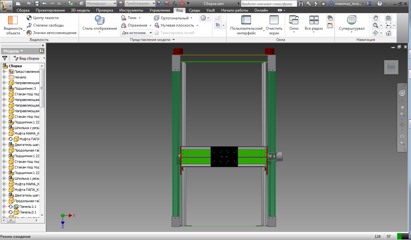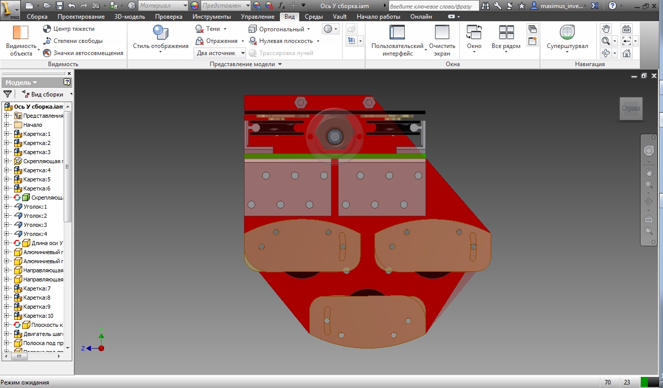 За последнее время доделал 3д модель и решили собирать вместе ось Х и ось У. Фоток нет, сделаю скрины с 3д модели (фото 1, 2, 3). Начали сборку, и оказалось что не хватает 3мм между колесами на каретки оси Х. Пришлось рассверливать отверстия в панели которая скрепляет 3 колеса и принтер. Так как расстояние между новыми отверстиями очень маленькое, сверло скакало и точность была не такая как хотелось, в следствии ось У (принтер) перекосило.