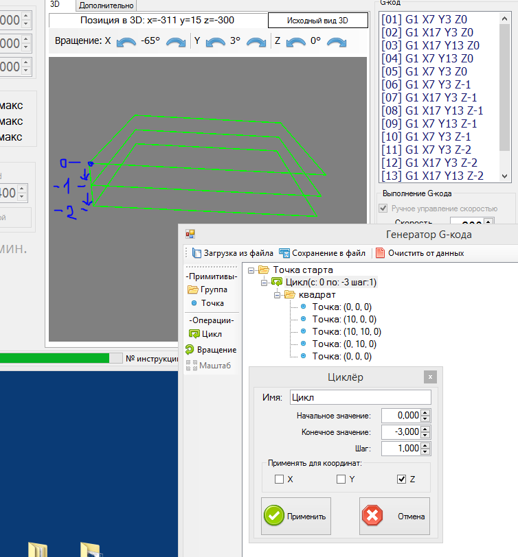 4) Вот пример того как создав группу из 5 точек (4-х линий) я сделал квадрат, и сместил группу в сторону, что-бы не сливался с отображаемыми осями. А добавив к этому "Цикл", который изменяется от 0 до -3 получил постепенное углубление, по периметру квадрата. тут конечно у меня ошибочка, дошло пока только до -2.
