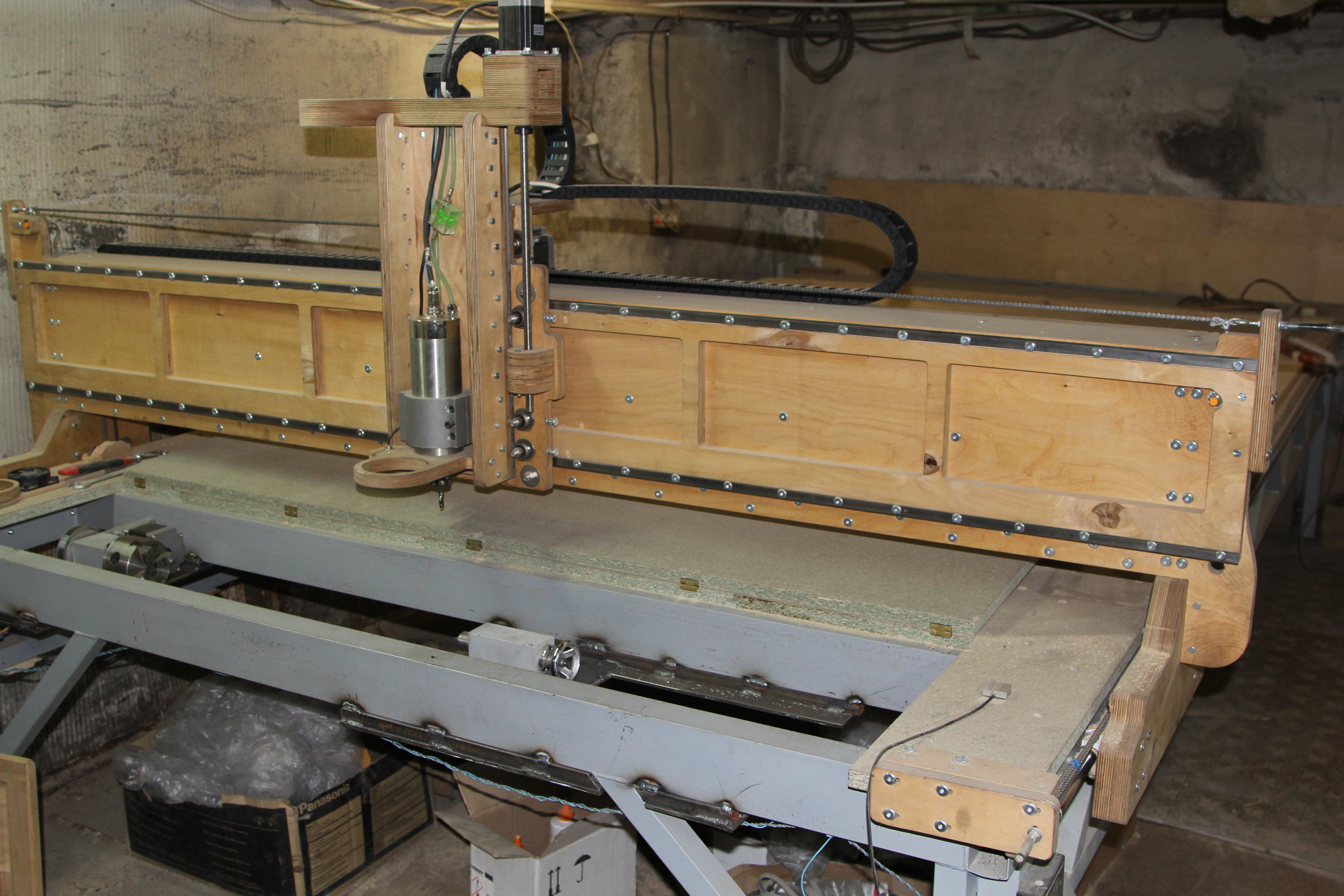 В общем, сделал так. На фото еще не полностью собранный станок в процессе тестов. Осталось кабель-каналы уложить, подключить вентиляцию двигателя в портале и лазер, поставить заднюю крышку. 4 ось оставил пока на попозже за недостатком времени.