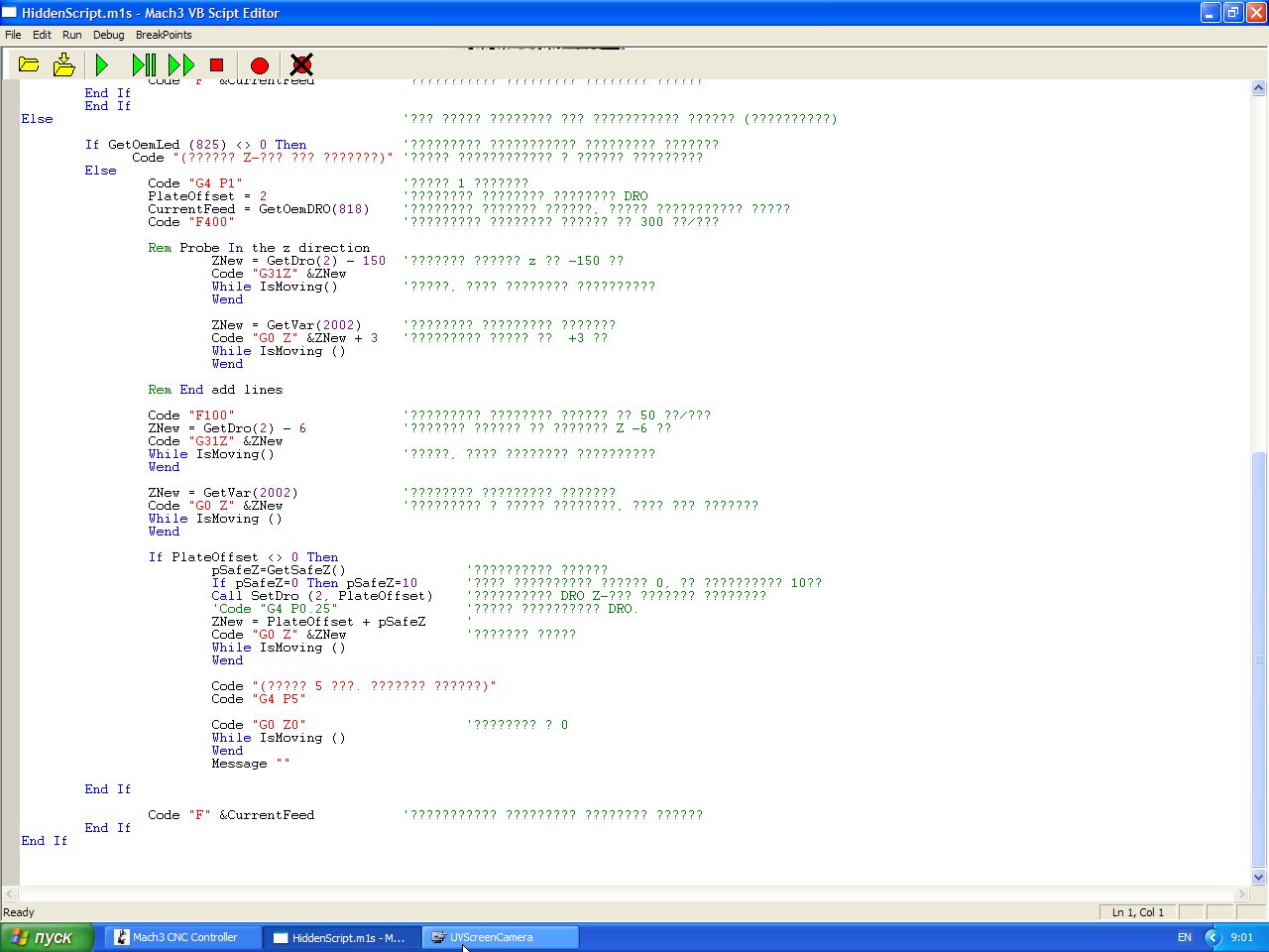 А русский текст Mach3 не отображает в редакторе скриптов.