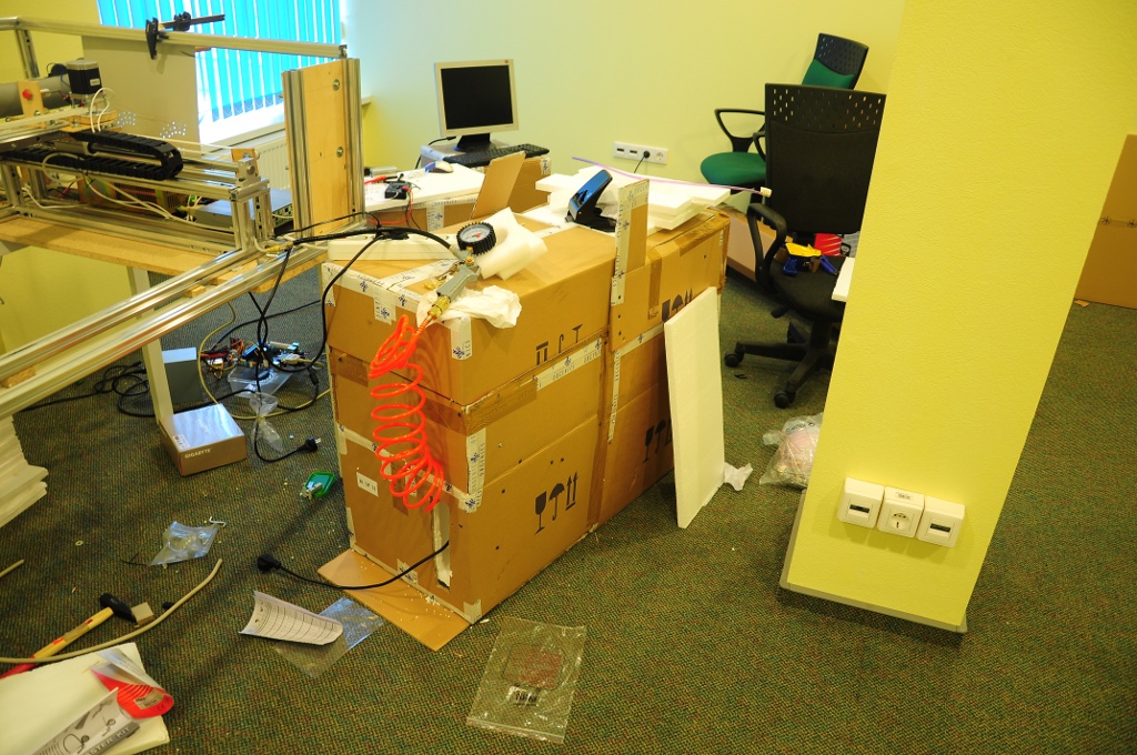 Компрессор и общий бардак. Также купил трубку для воздуха, купил в магазине аквариумов. Штуцер сделал из стопорного винта M5, в нем по центру просверлил отверстие Ф2.5мм, и вкрутил в голову. Надо бы еще все это дело на ленту фум посадить, ибо травит слегка. В общем осталось с управлением лазером разобраться и можно пробовать