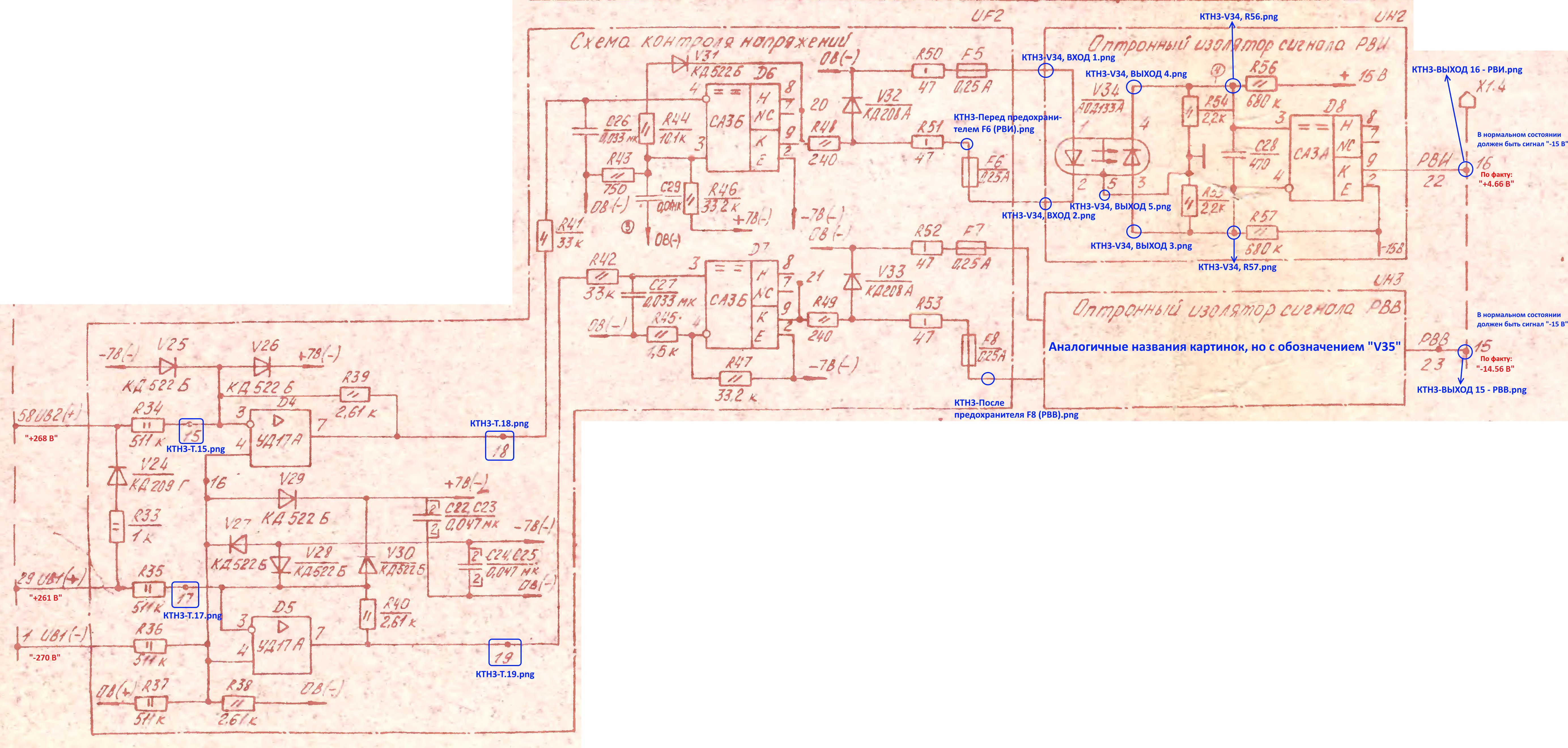 Померил сигналы РВВ и РВИ мультиметром - РВВ = "-14,57 В", РВИ = "+4,57 В". При этом вольтметр в шкафу показывает 540 Вольт -> выпрямитель значит работает, а инвертор не включается. Сигналы эти идут из платы КТН3, ниже часть её схемы, которая формирует сигналы РВВ и РВИ. Потыкался осциллографом по разным точкам, сравнил (благо схемы на РВВ и РВИ схожие). Картинки подробные под спойлером. Вкратце: до оптронов сигналы на РВВ и РВИ приходят одинаковые, а на выходе оптронов - сигналы разнятся. Пока ещё не анализировал кто тут виновник сего безобразия.