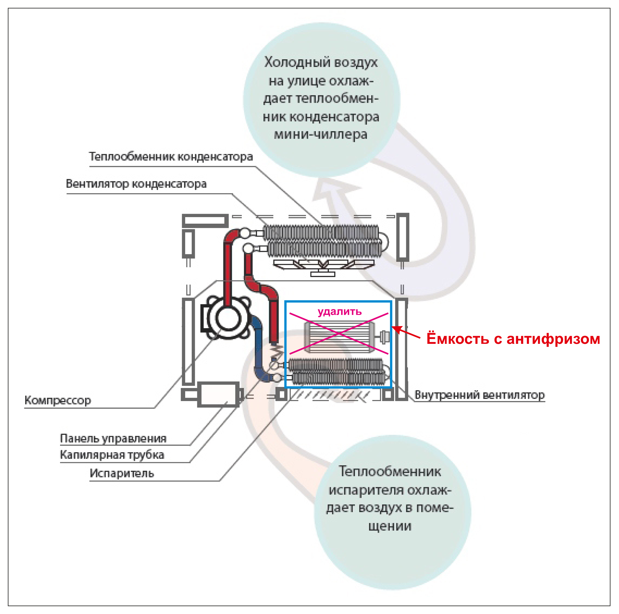 Если выкинуть барабанный вентилятор, который гонит холодный воздух, а на его место поставить прямоугольный бачёк с антифризом и в него поместить испаритель.