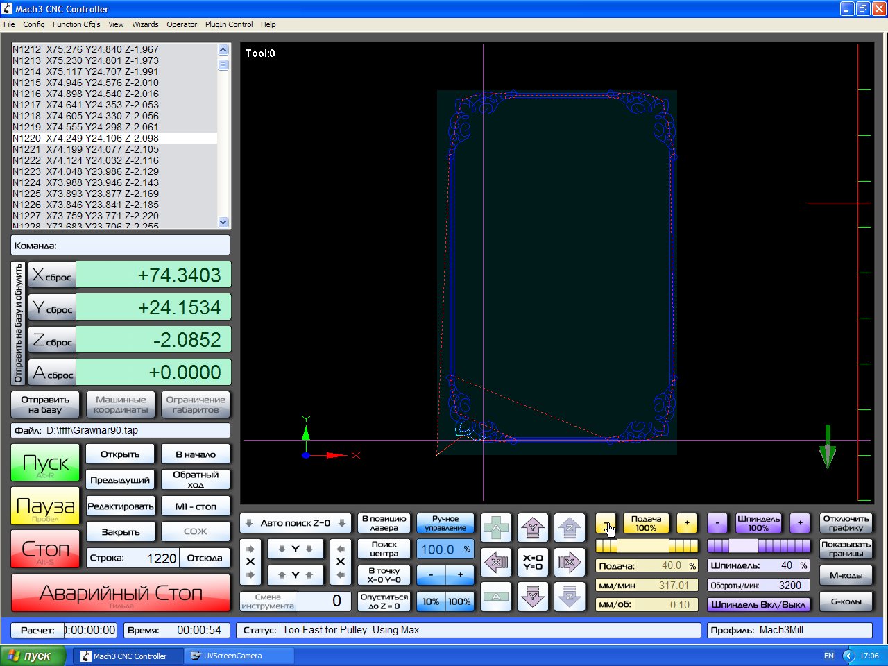 1. Попробуй со стандартным скрином.ZONG писал(а):кстати о скорости подачи! пользуюсь мачь3 с известным нам всем скином от уважаемого michael-yurov и не раз сталкивался с тем что нужно чуть притормозить станок крутилкой или ускорить изза того что в арткаме недооценил возможности станка но как я не крутил увы облом! скорость ручных перемещений регулируются а подачи уп нет, дело в скринсете? маче? или контролере от пурлогика работающем через lan сеть?