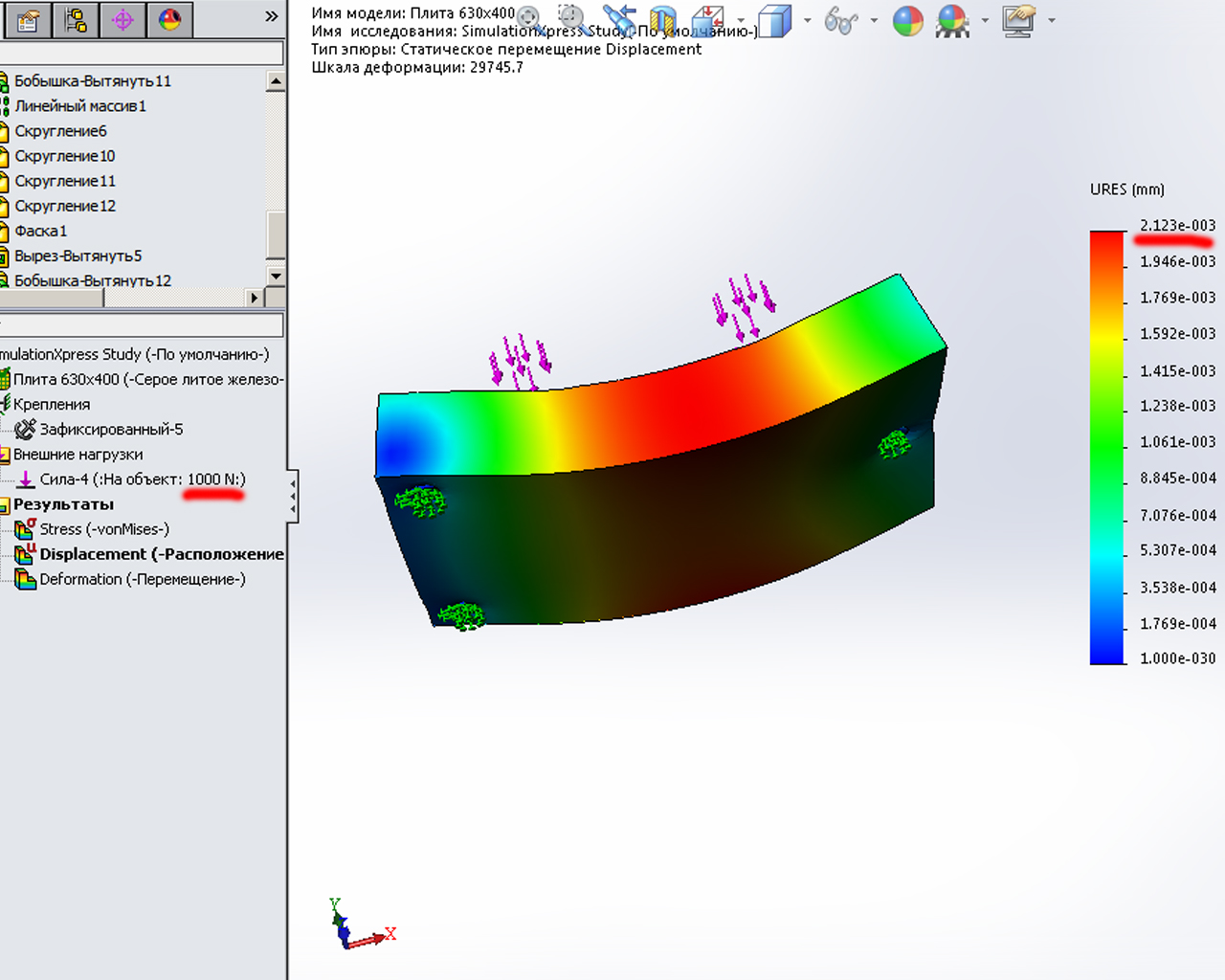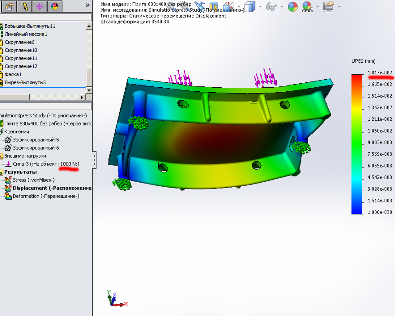 Приложил одинаковую силу в 1000N в местах крепления кареток к стандартной поверочной плите, к плите без внутренних рёбер жесткости, и к цельной чугунной плите Получается самая "слабенькая" плита с рёбрами жесткости?