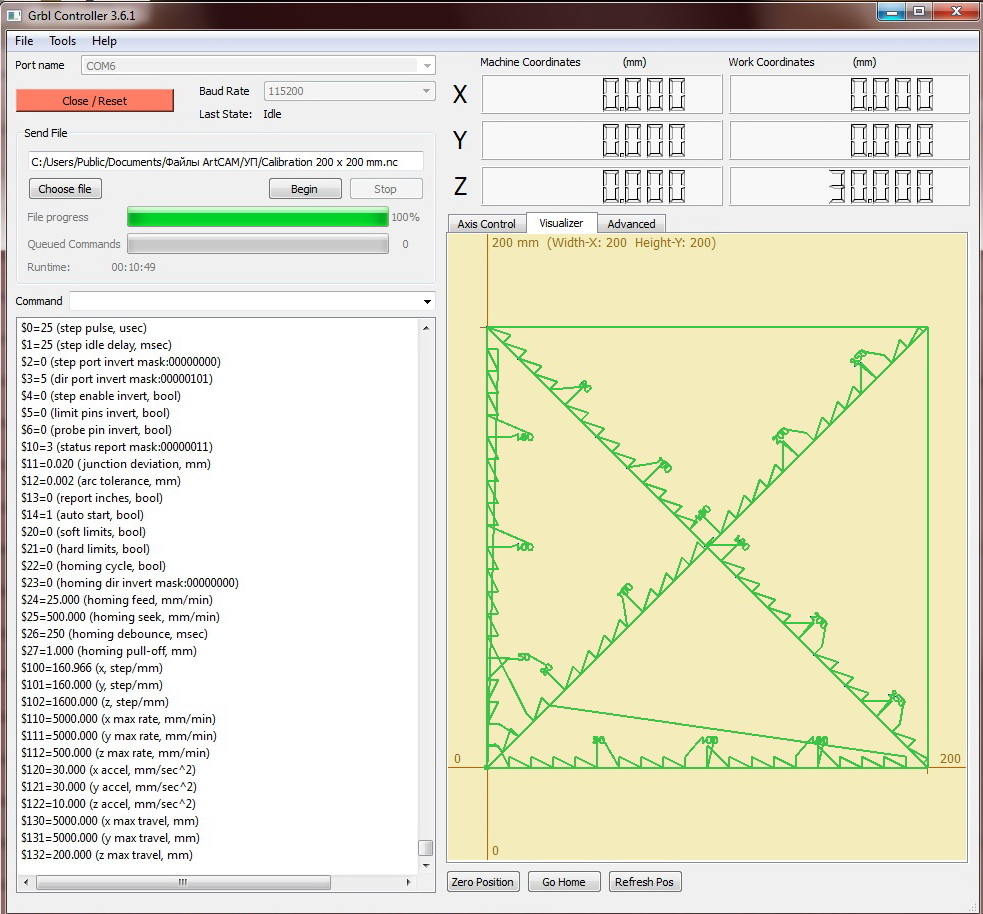 После - запустил свой калибровочный код 200х200 (Фото во вложении). По оси "У" 201 мм получился, а по "Х" 203,5 мм.