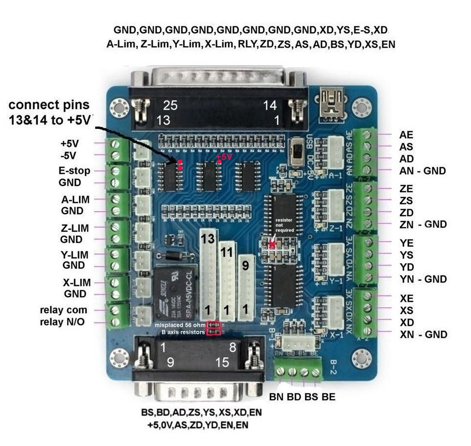 плата простая до безобразия, все расписано и не раз - это первое, второе - выложи фото как она подключена у тебя(с обозначениями что куда подвел) и настройки мача, тут провидцев нет. в третьих на кой тебе В и С, если ты новичок (часто делают дублирующую одну из осей, либо доп перемещения вдоль одной из осей), мало x,y,z,a?