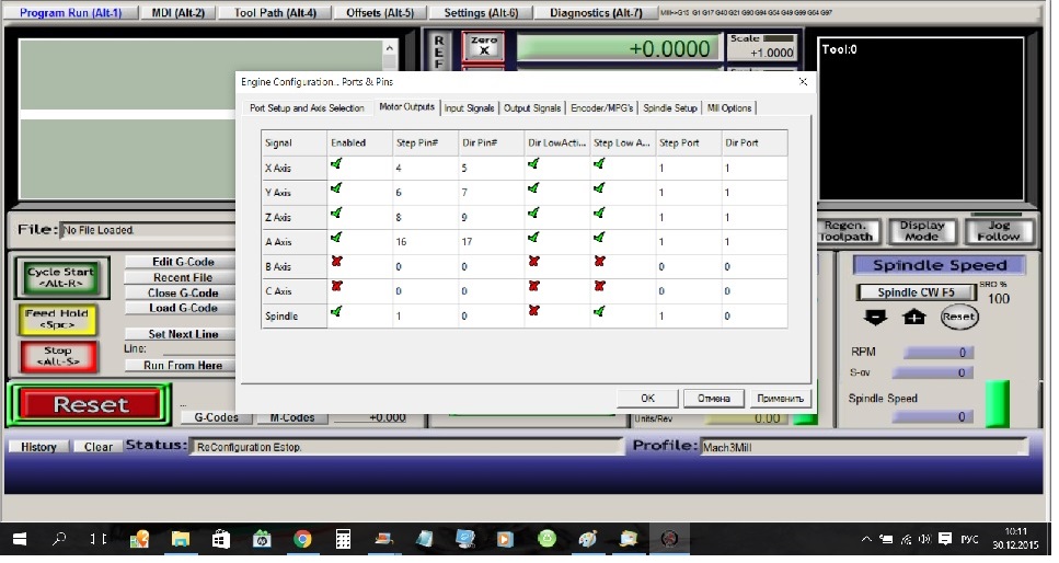Когда запускаешь Mach то кнопка сразу моргает я нажимаю как написано . На диске шел файл В папке иероглифами Mach3Mill.xml.и 1024.set. Я помещаю и один и оба в папку с программой и появляются настройки моторов и портов. Но проблема и с этим фалом, и без него, и при настройке руками, и нашел в инете подобный фал, кто то выложил, он конечно не к моему станку но та же проблема.