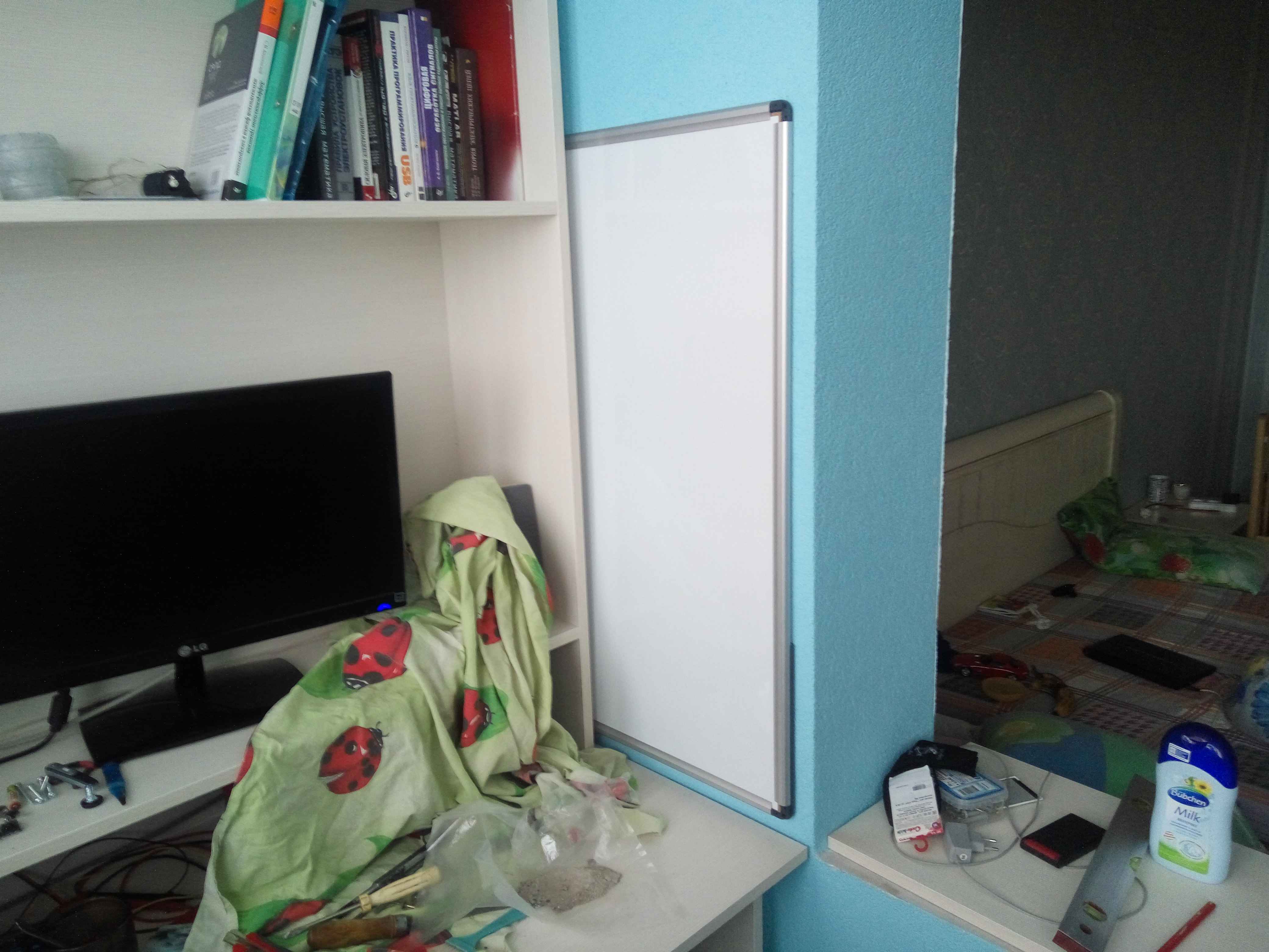 Темы у меня подходящей нет, ну а для меня момент позитивный, похвастаюсь... Давно облизывался на маркерную доску, иногда удобно что-то набросать или повесить на магните, и тут случайно ее подарили, а места то нет, чтобы повесить... Думал, думал, в итоге придумал...