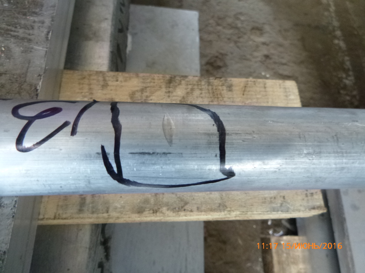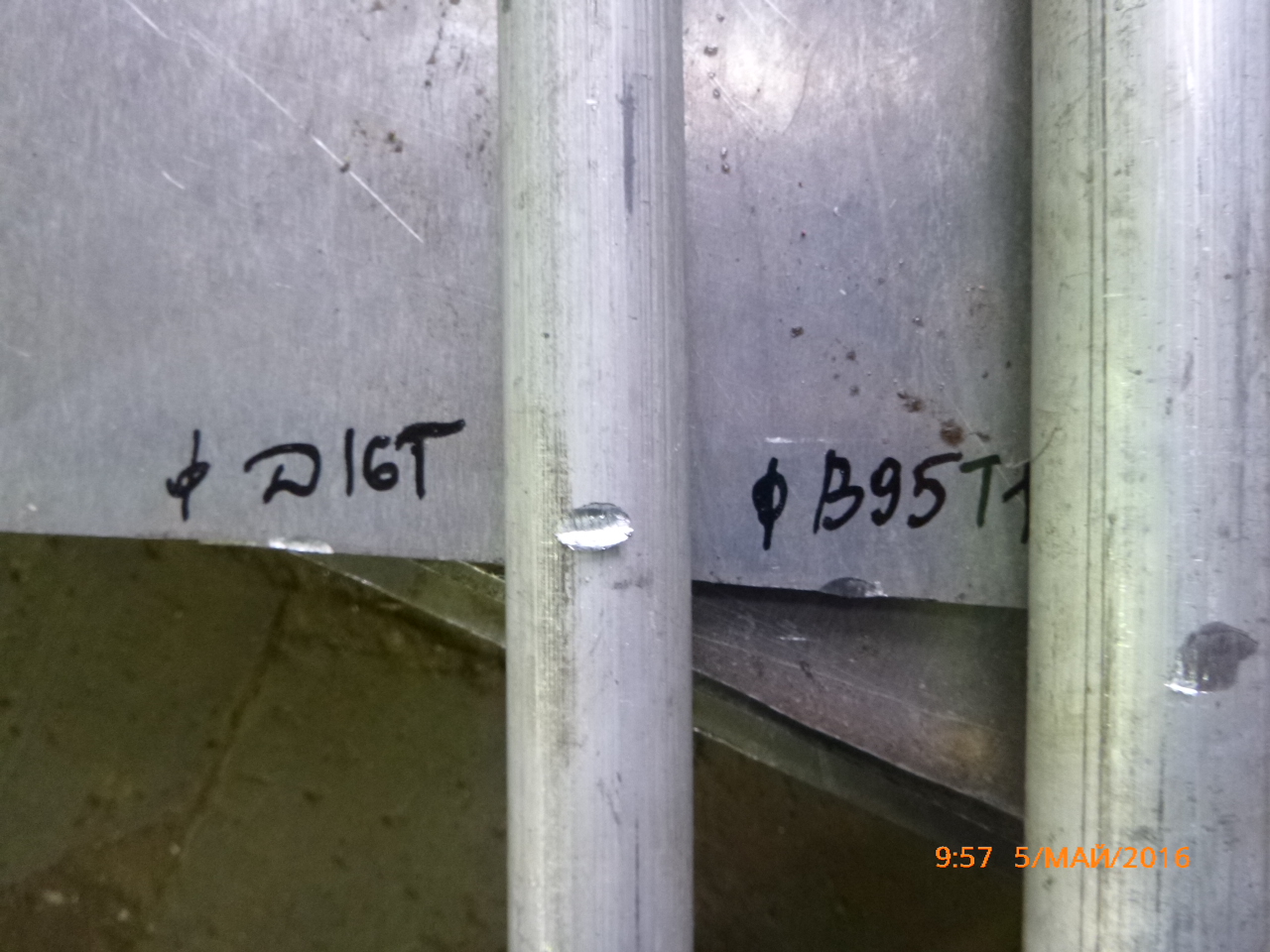 Попросил определённым способом, по ребру стукнуть прутком, В95Т1. И посмотреть, что получится. Чего-то мне показалось, пруток В95Т1 твердоват, вмятина на прутке несущественна, а на листе как-то замято многовато. Ну, думаю, вдруг режим Т2 так смягчает твёрдость, что до Т1 далеко.