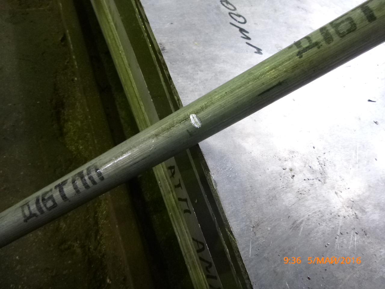 Попросил определённым способом, по ребру стукнуть прутком, В95Т1. И посмотреть, что получится. Чего-то мне показалось, пруток В95Т1 твердоват, вмятина на прутке несущественна, а на листе как-то замято многовато. Ну, думаю, вдруг режим Т2 так смягчает твёрдость, что до Т1 далеко.